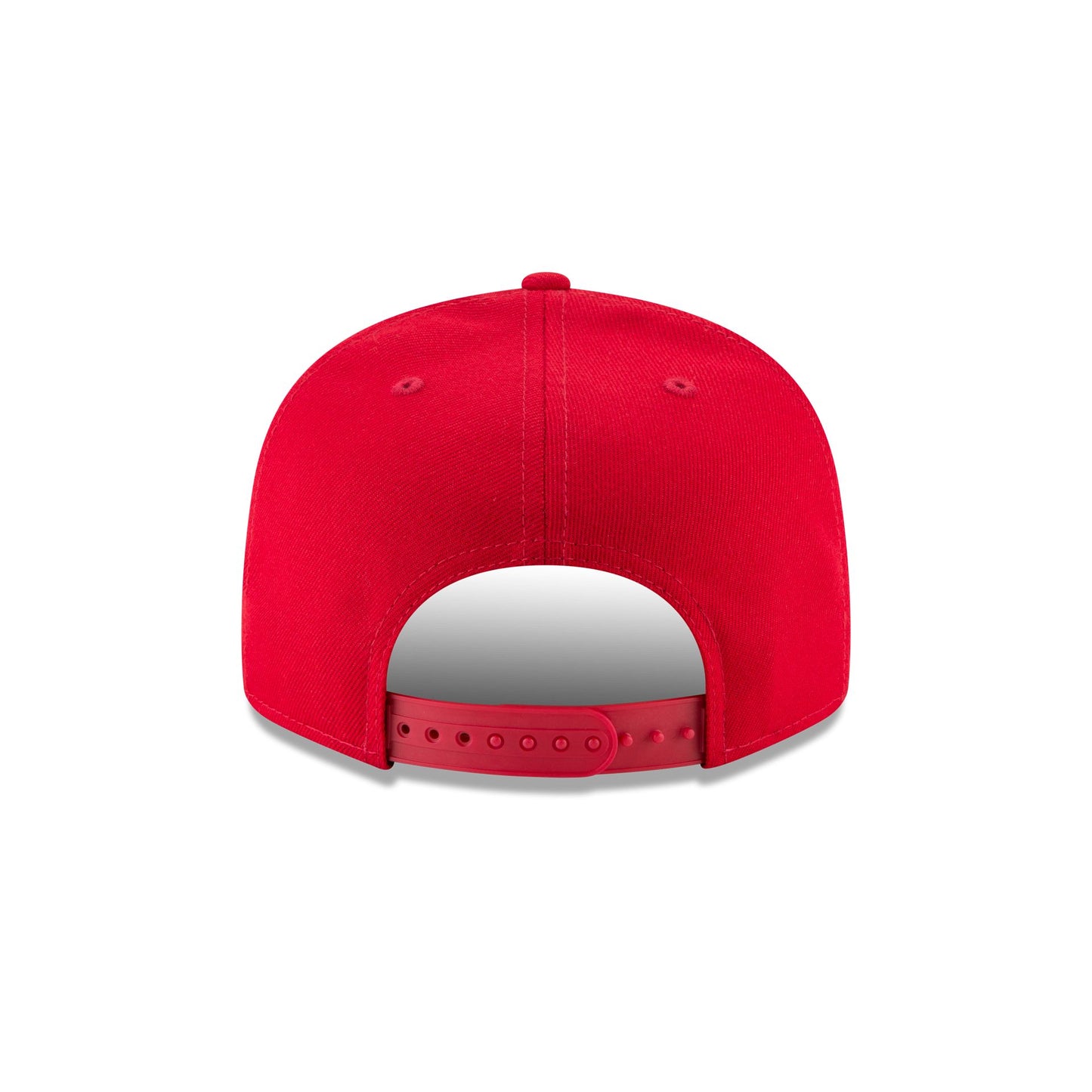 The Cincinnati Reds 2025 Postseason Side Patch 9FIFTY Snapback features an embroidered Reds logo at the front panels with a 2025 Postseason patch at the right-wear side and an adjustable snapback closure at the rear.