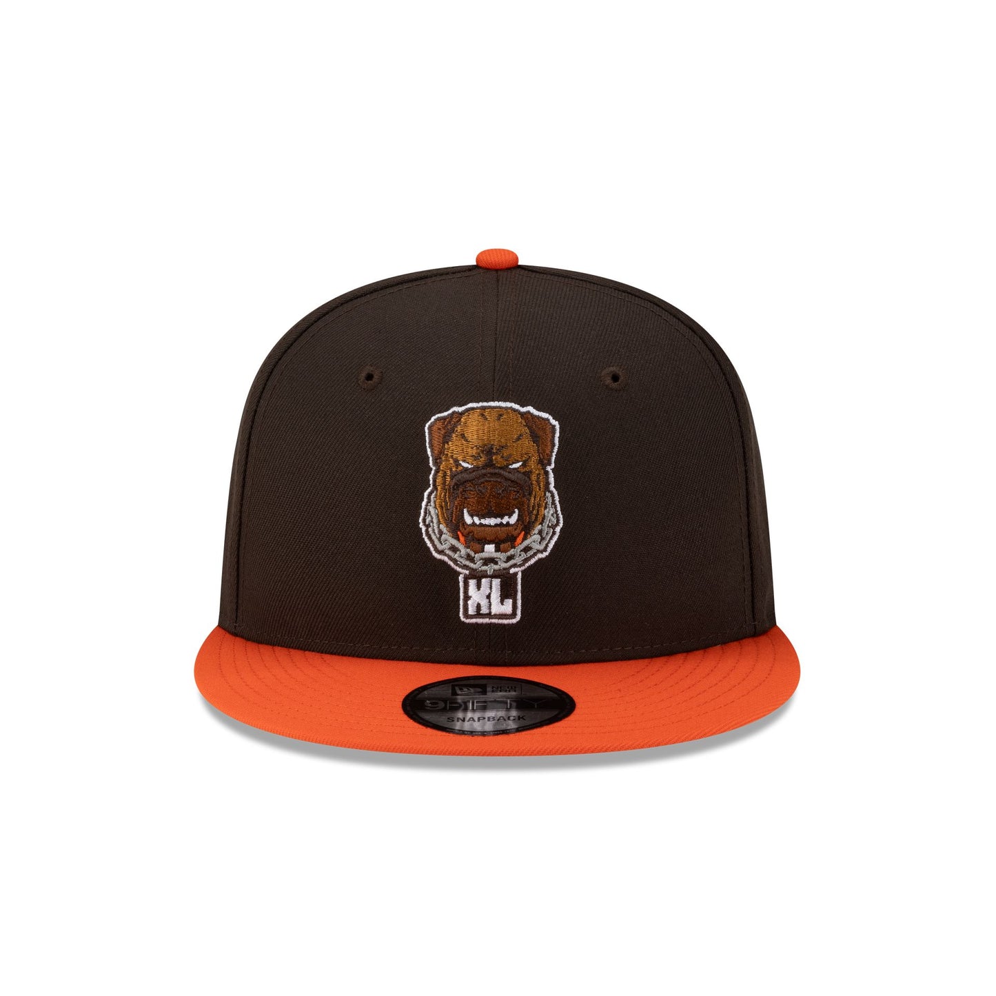 The Cleveland Browns Dawg Pound 40th Anniversary 9FIFTY Snapback features an embroidered Dawg Pound XL logo at the front panels with a Dawg Pound wordmark at the right-wear side. Additional details include a snapback closure at the rear and a gray undervisor.