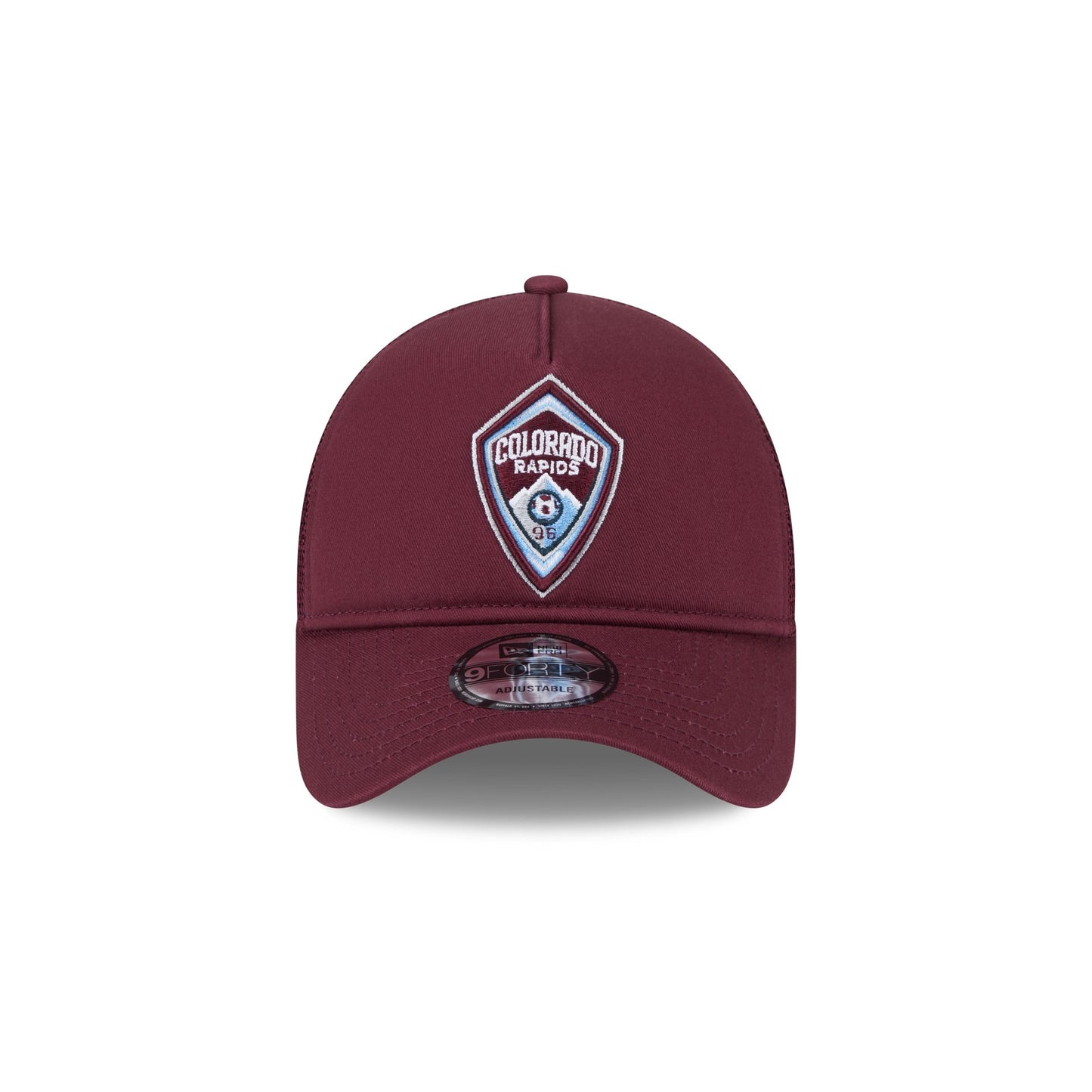 The Colorado Rapids Team 9FORTY A-Frame Snapback features an embroidered Rapids logo at the front panels with a mesh back and a snapback closure at the rear.