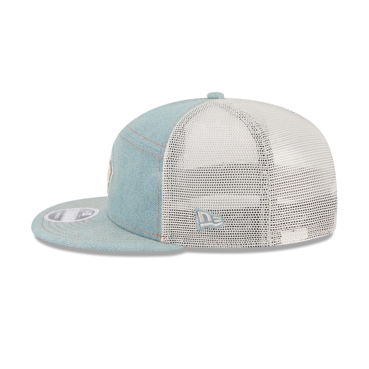 The Connecticut Huskies Denim 9FIFTY Split Panel Trucker Hat features an embroidered Huskies logo at the front panels with an adjustable snapback closure at a mesh rear.