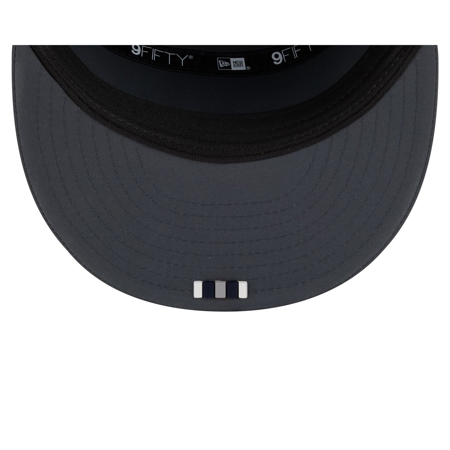 The Dallas Cowboys 2025 Sideline Cold Weather Steel Clouds Split Panel 9FIFTY Snapback features a sewn-down silicone Cowboys logo patch at the front panels with a split-crown construction and diamond quilting. The cap has a water-repellent quill tech fabrication throughout, with a quick-dry cushioned sweatband to absorb moisture. Additional details include the Official NFL Shield logo to the right of a soft silicone snapback closure at the rear with eyelets at each side panel. The undervisor is accented with a silicone transfer in the team’s colors.