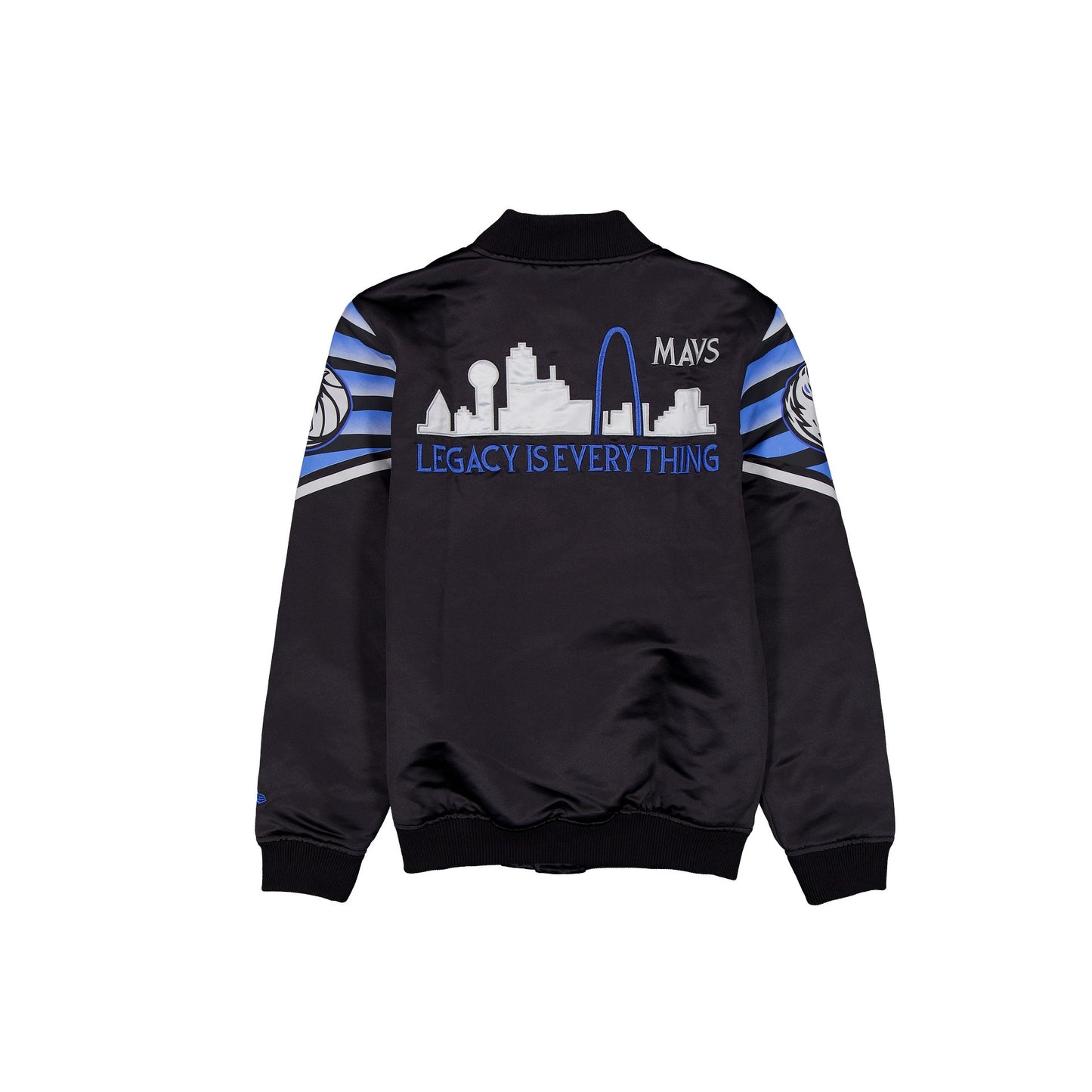 The Dallas Mavericks 2025 City Edition Black Jacket features an embroidered Mavericks City Edition wordmark at the front with an embroidered script arena address and woven City Edition jock tag at the left hip. Additional details include an applique graphic at the rear, a satin fabrication throughout, and a snap-button closure with front pockets.