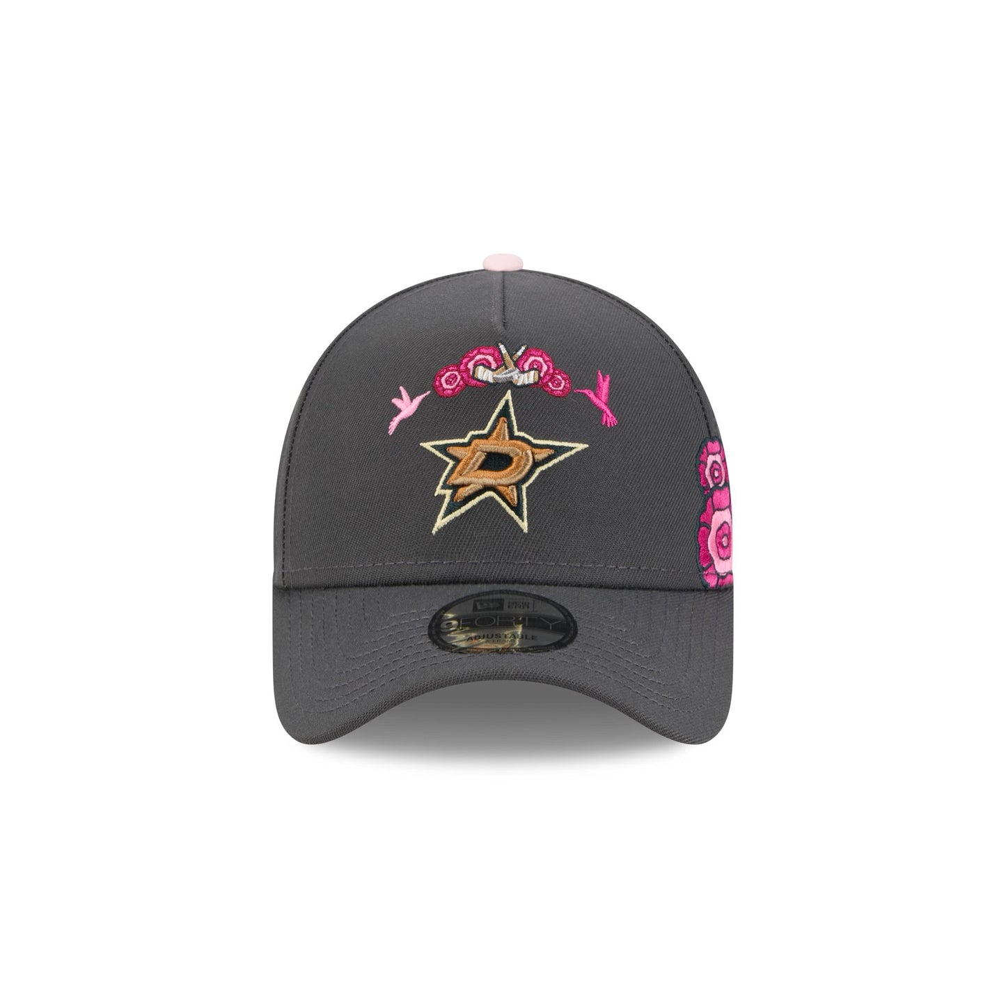 The Dallas Stars Day of the Dead Graphite 9FORTY A-Frame Snapback features an embroidered Stars logo at the front panels with marigold (cempasúchil) and hummingbird designs throughout, representing the Legend of Xóchitl and Huitzilin. Additional details include a team patch at the right-wear side and an adjustable snapback closure at the rear.