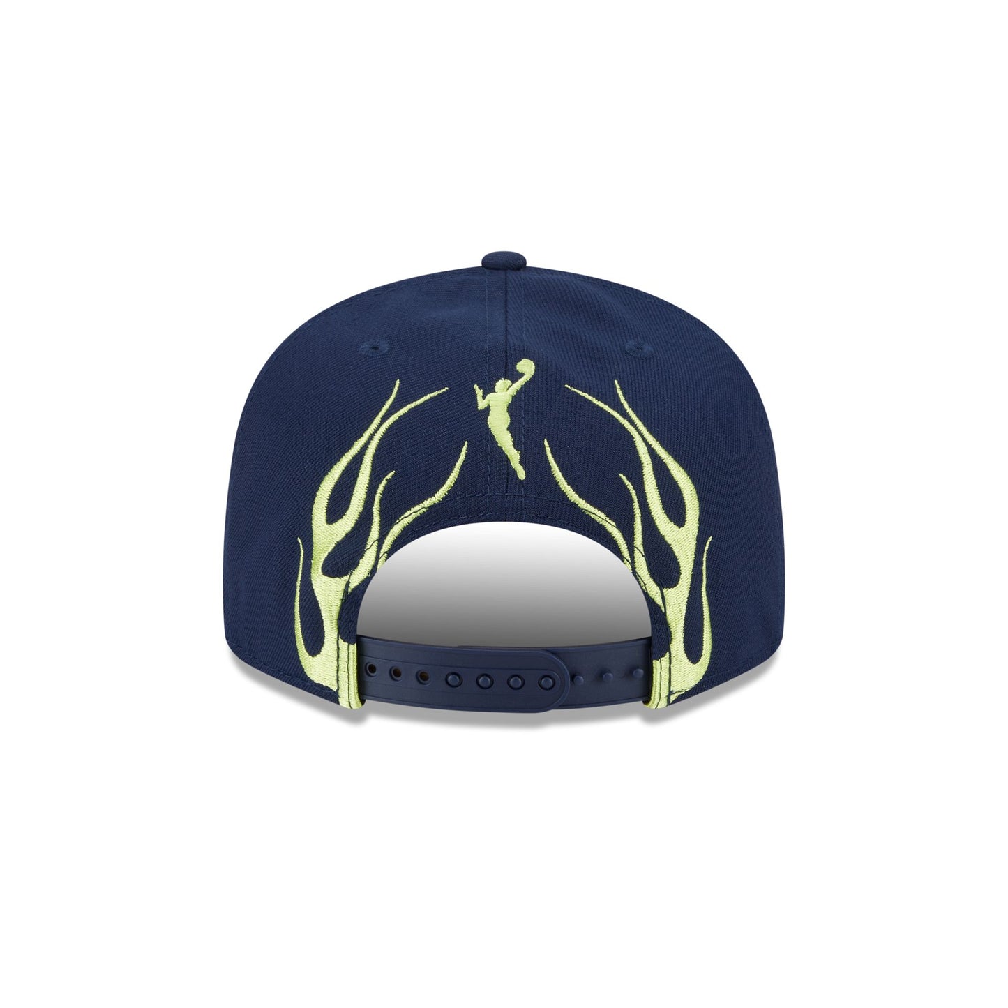The Dallas Wings 2025 All-Star Game 9FIFTY Snapback features an embroidered Wings logo at the front panels with matching flames at the visor and a WNBA Logowoman above an adjustable snapback closure at the rear.