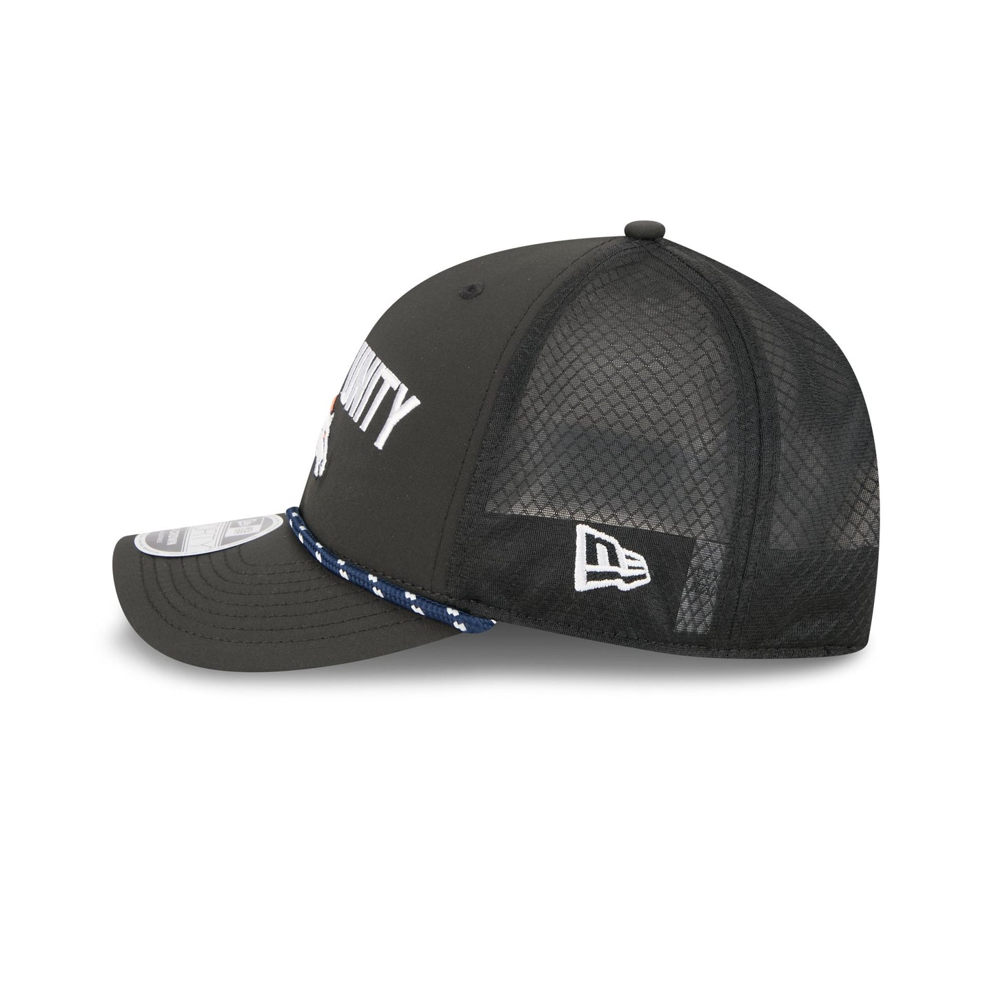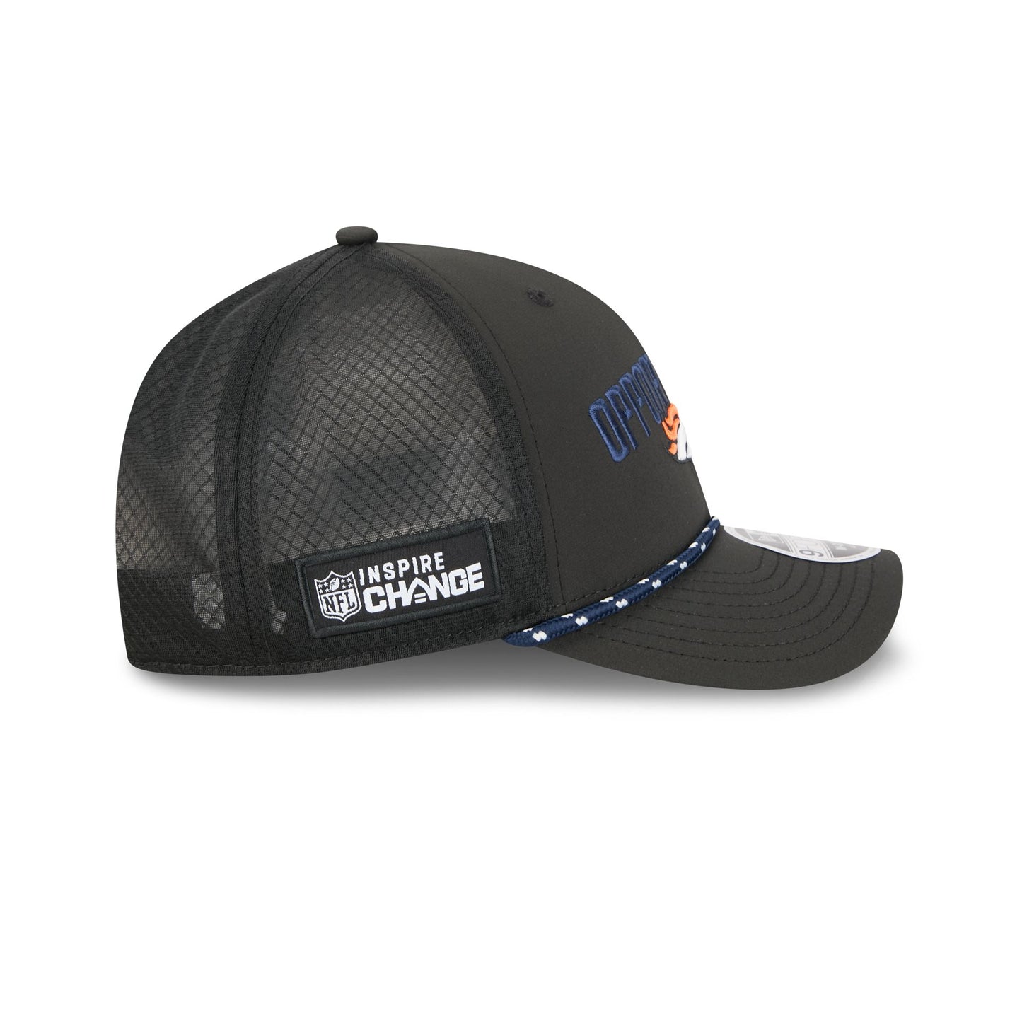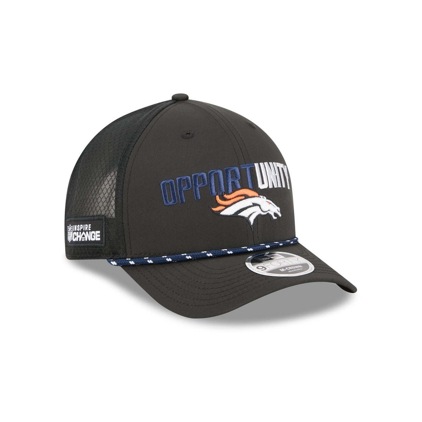 The Denver Broncos 2025 Inspire Change 9FORTY M-Crown Snapback features an embroidered Broncos logo and matching "Opportunity" wordmark at the front panels with an NFL Inspire Change patch at the right-wear side. Additional details include a rope at the visor and an adjustable snapback closure at the rear.