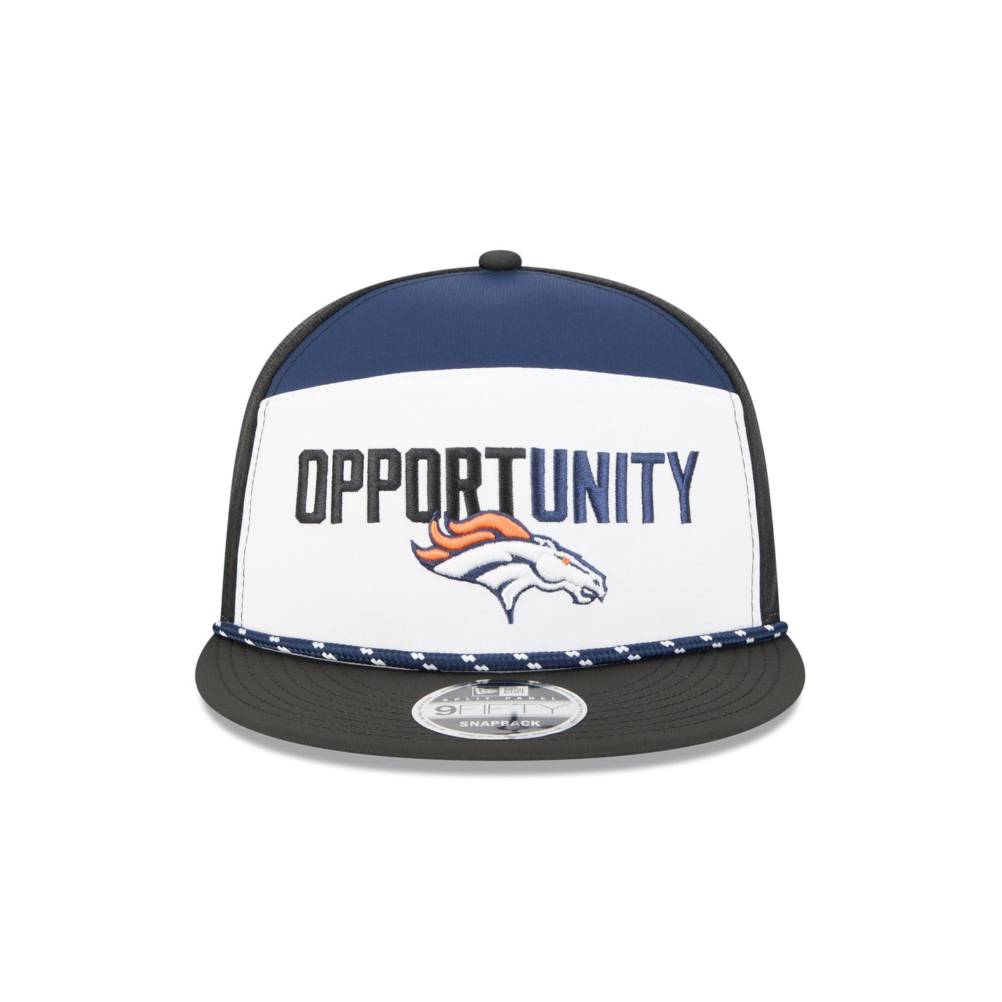 The Denver Broncos 2025 Inspire Change Split Panel 9FIFTY Snapback features an embroidered Broncos logo and matching "Opportunity" wordmark at the front panels with an NFL Inspire Change patch at the right-wear side. Additional details include a rope at the visor and an adjustable snapback closure at the rear. The cap has a split crown construction.