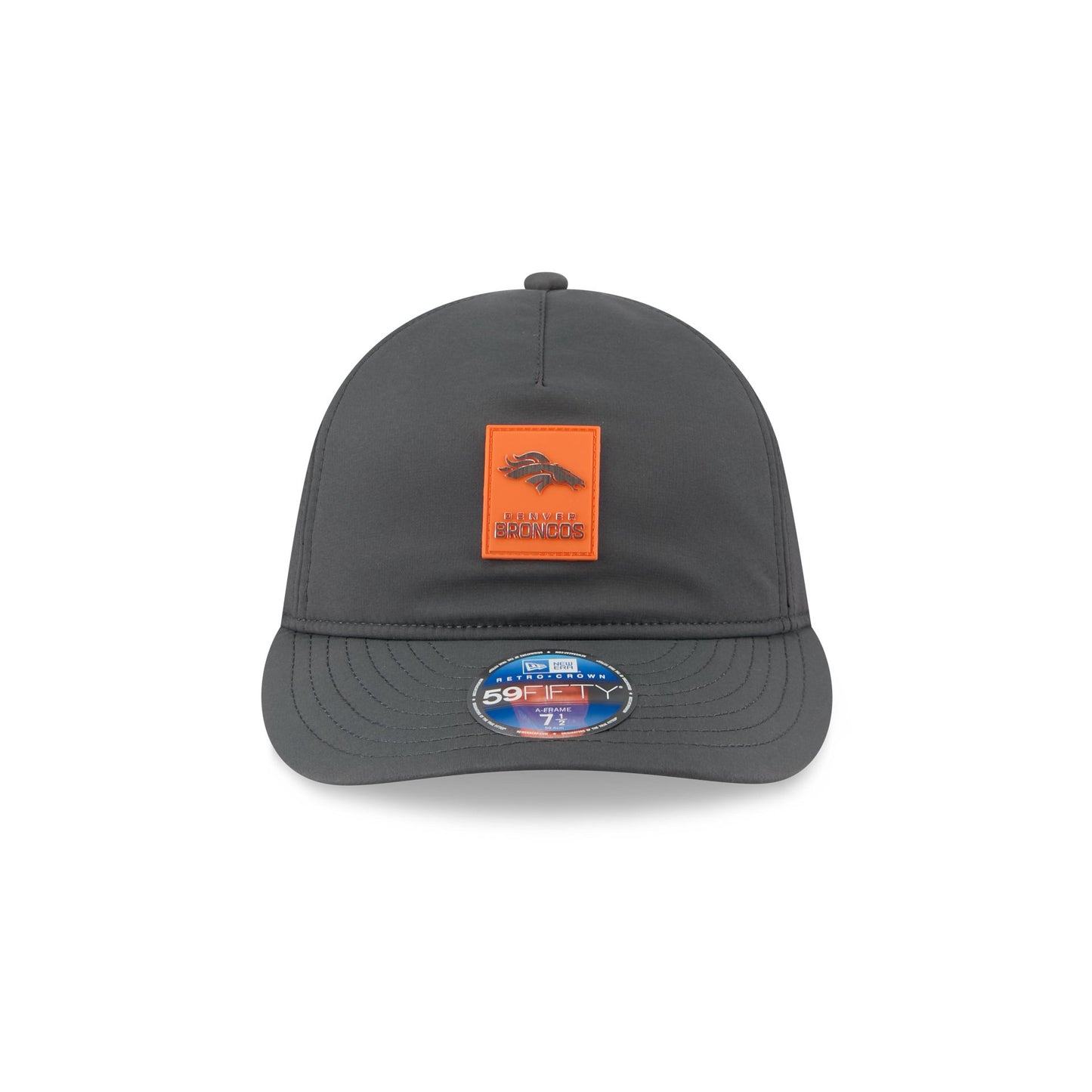 The Denver Broncos 2025 Sideline Cold Weather Steel Clouds Retro Crown 59FIFTY A-Frame Fitted Cap features a sewn-down silicone Broncos logo patch at the front panels with the Official NFL Shield logo at the rear. The cap has a water-repellent quill tech fabrication throughout, with an insulated crown and quick-dry cushioned sweatband. The undervisor is accented with a silicone transfer in the team’s colors.