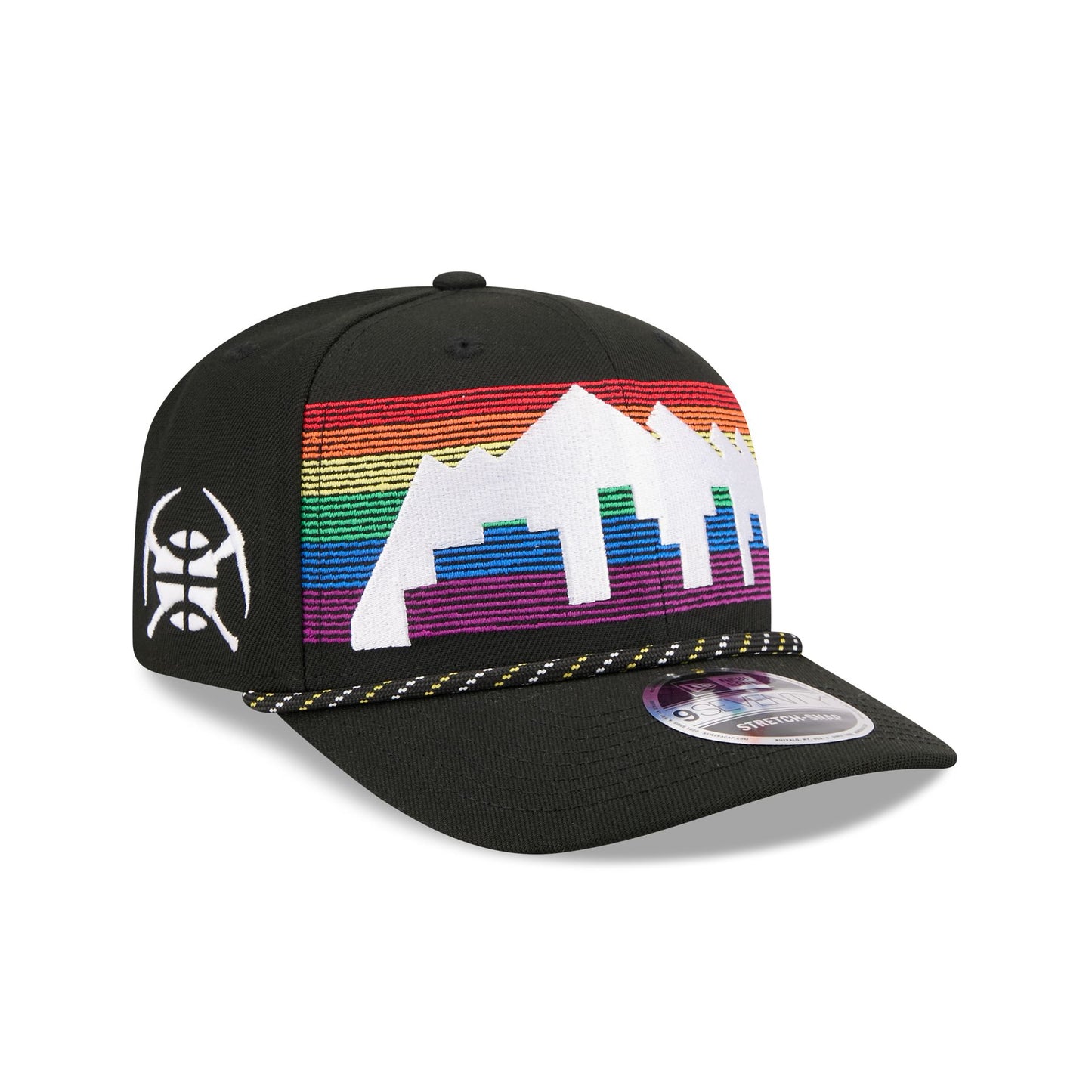 The Denver Nuggets 2025 City Edition 9SEVENTY Stretch-Snap features an embroidered Nuggets City Edition logo at the front panels with a logo at the right-wear side and a rope at the visor. Additional details include the NBA Logoman above an adjustable stretch-snap closure at the rear and a gray undervisor.