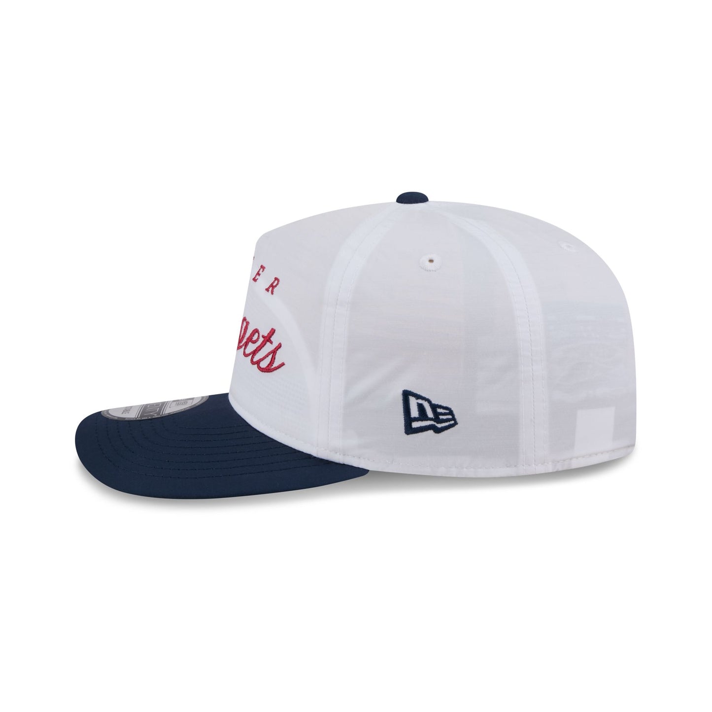 The Denver Nuggets 2025 Draft 19TWENTY Adjustable Cap features an embroidered Nuggets script wordmark at the front panels with a team logo at the right-wear side. Additional details include a woven silicone NBA Logoman patch above an adjustable buckle closure at the rear and a gray undervisor. The strap features a National Basketball Association gel print wordmark.