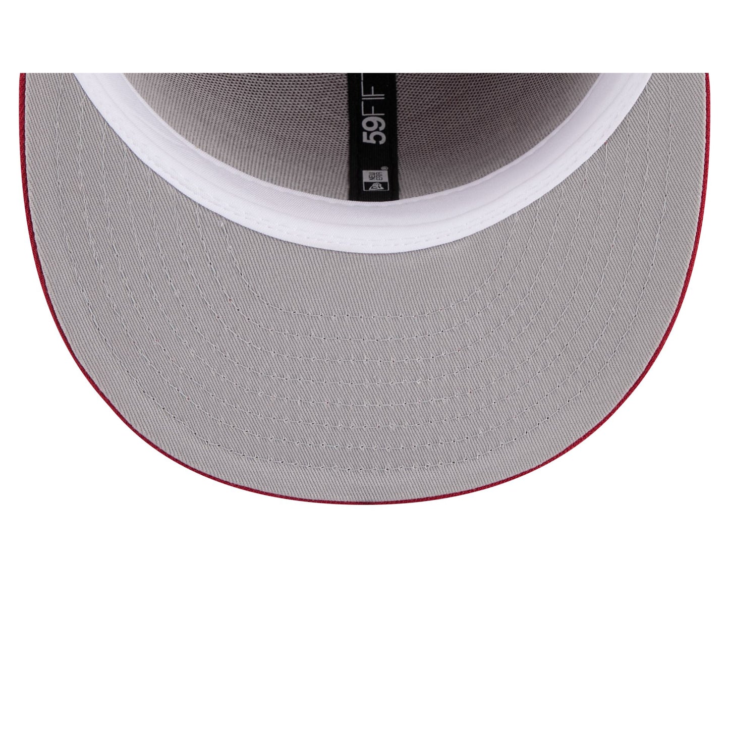 The Denver Nuggets 1993-2002 Hardwood Classics Sidepatch 59FIFTY Fitted Cap features an embroidered vintage Nuggets logo at the front panels with a 50th Anniversary patch at the right-wear side. Additional details include the NBA Logoman at the rear and a gray undervisor.