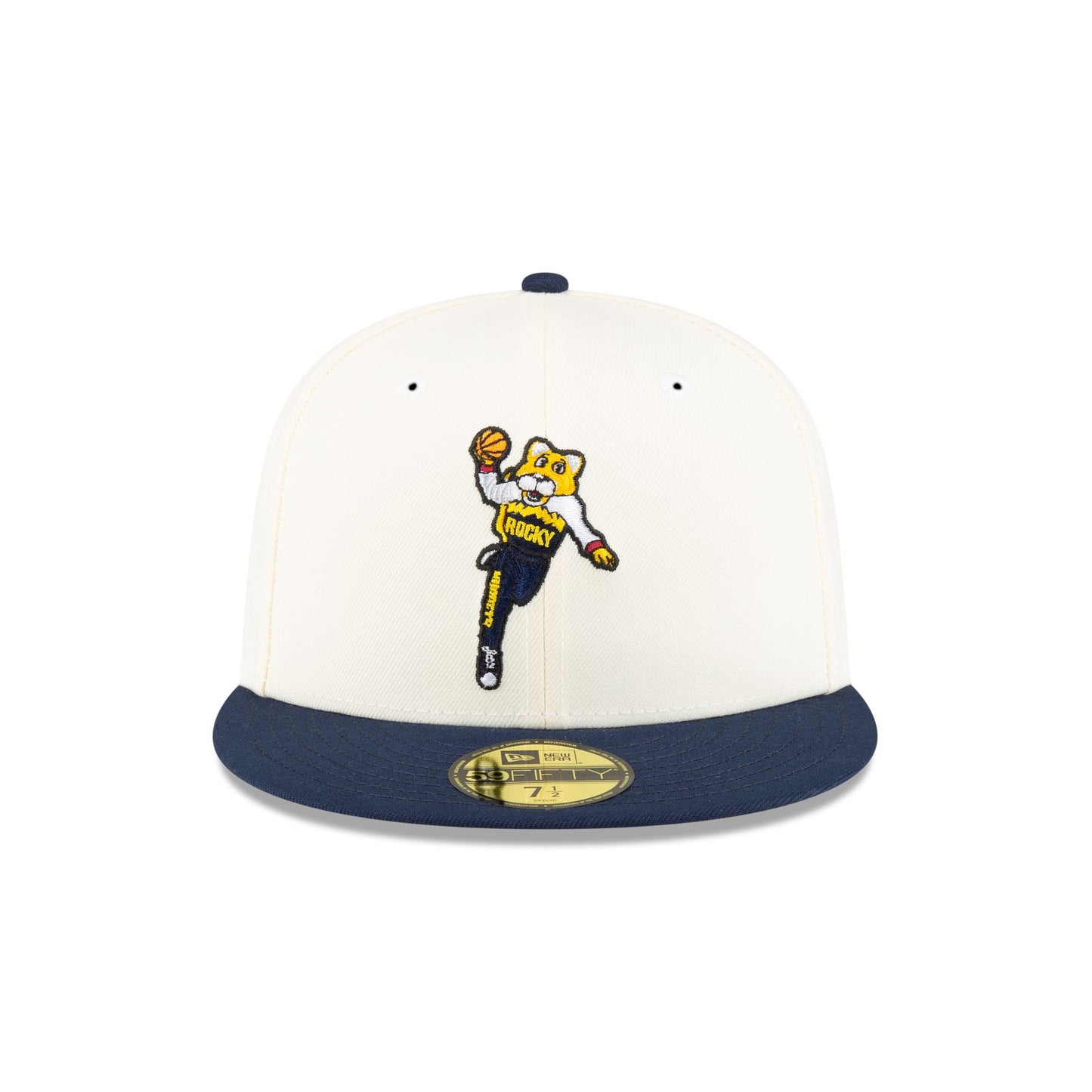 The Denver Nuggets Mascot 59FIFTY Fitted Cap features an embroidered Nuggets mascot logo at the front panels with a matching team wordmark at the rear and a gray undervisor.