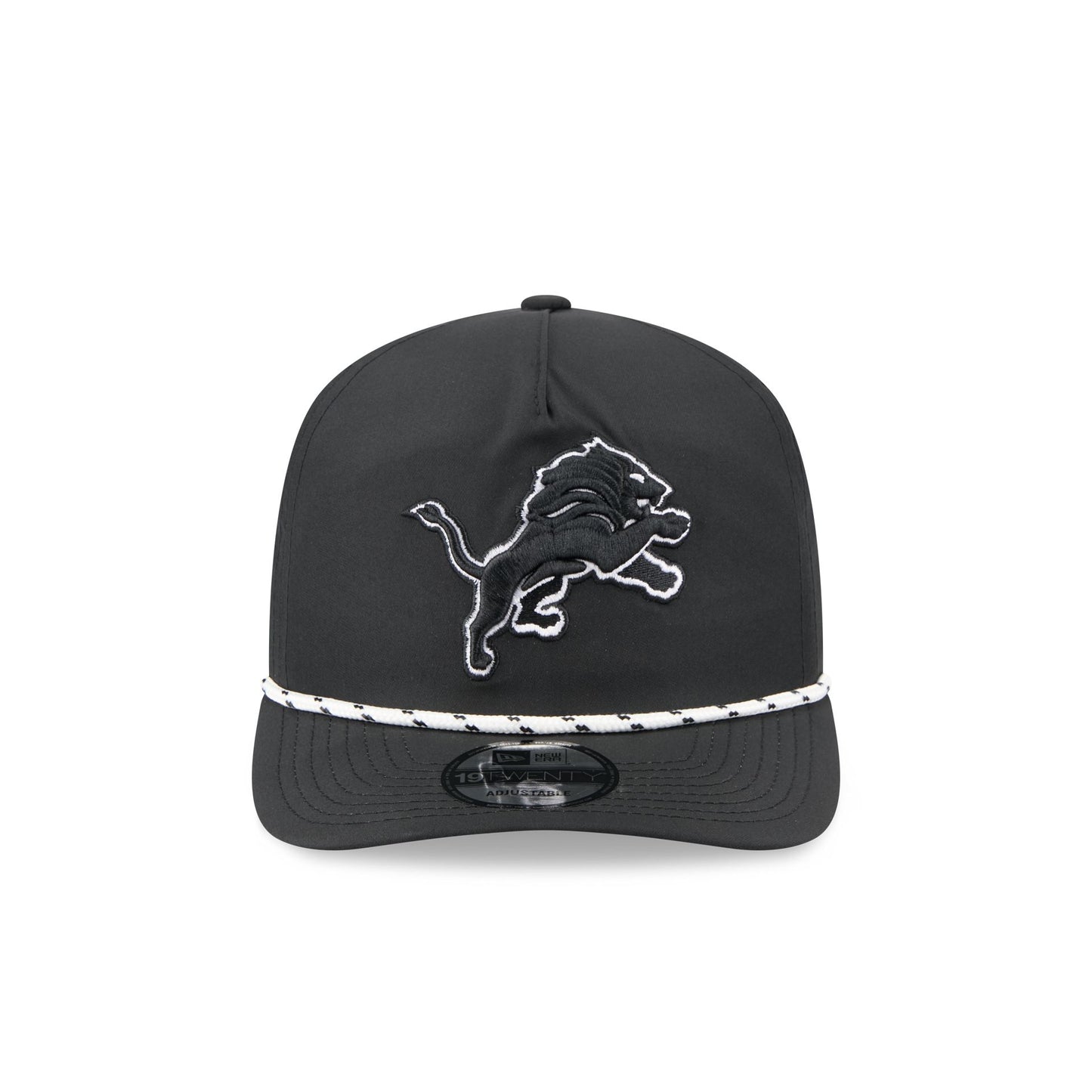 The Detroit Lions Black and White Rope 19TWENTY Snapback features an embroidered Lions logo and rope at the front with a snapback closure at the rear and a gray undervisor.