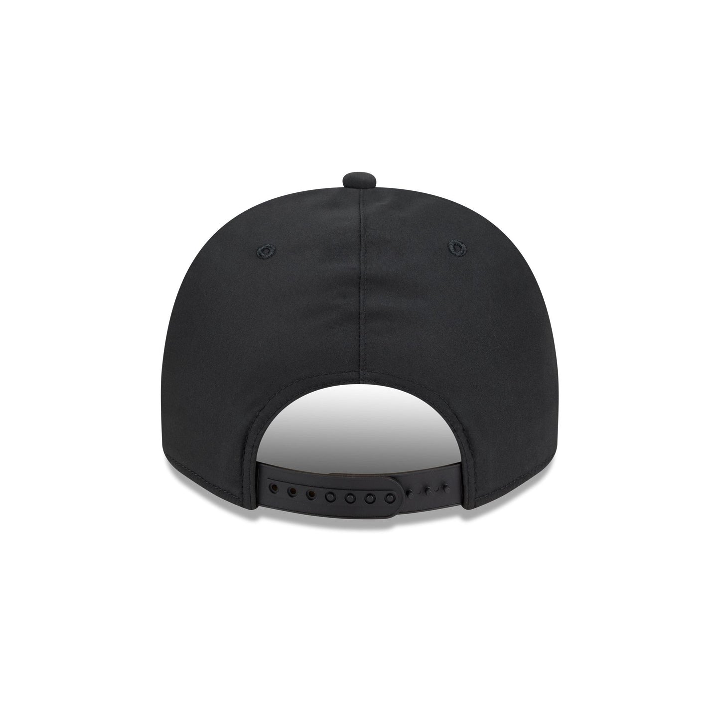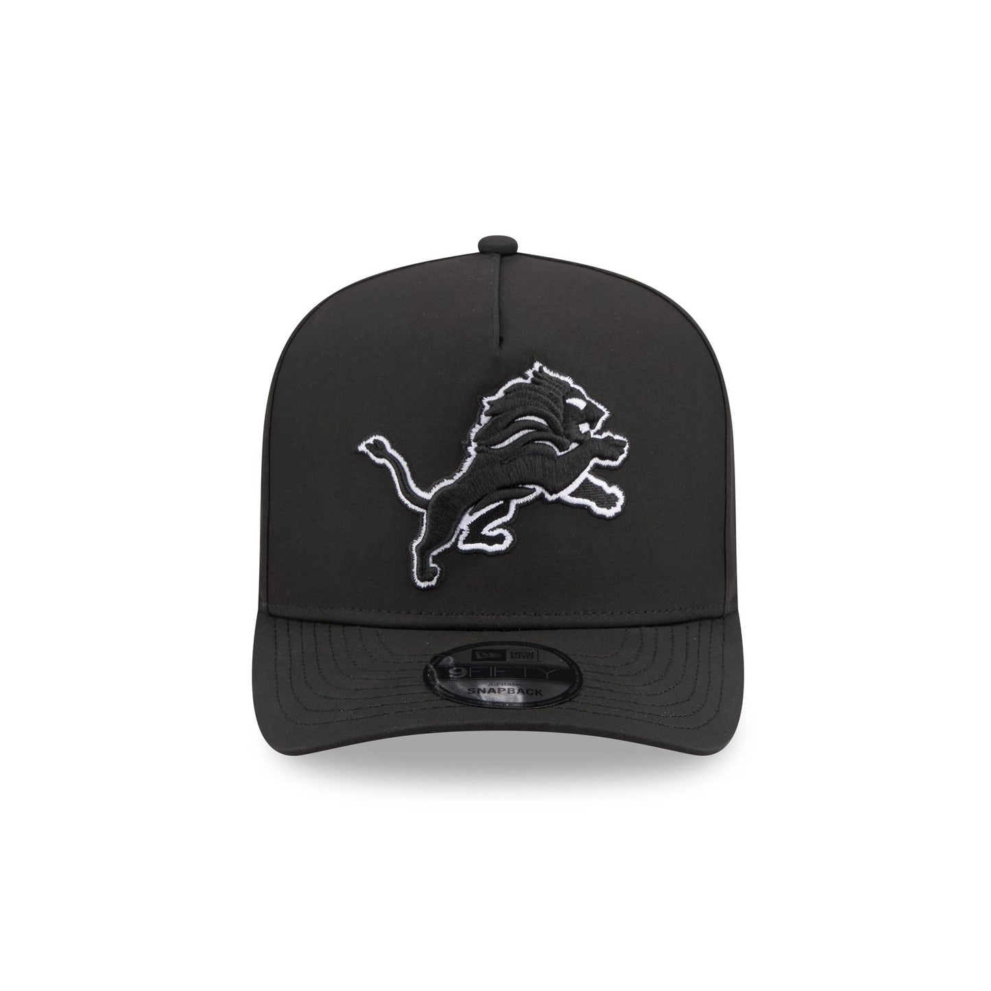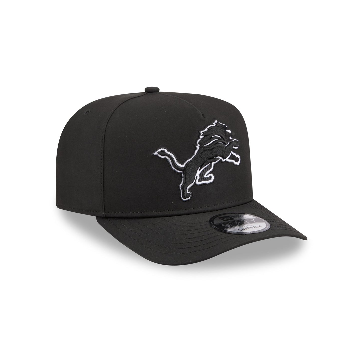 The Detroit Lions GORE-TEX Black 9FIFTY A-Frame Snapback features an embroidered white Lions logo at the front panels with a metallic sheen silicone New Era Flag logo and GORE-TEX logo at the left-wear side. Additional details include an adjustable snapback closure at the rear, a gray undervisor, and a polyester fabrication throughout the cap. It is waterproof, breathable, and lightweight.