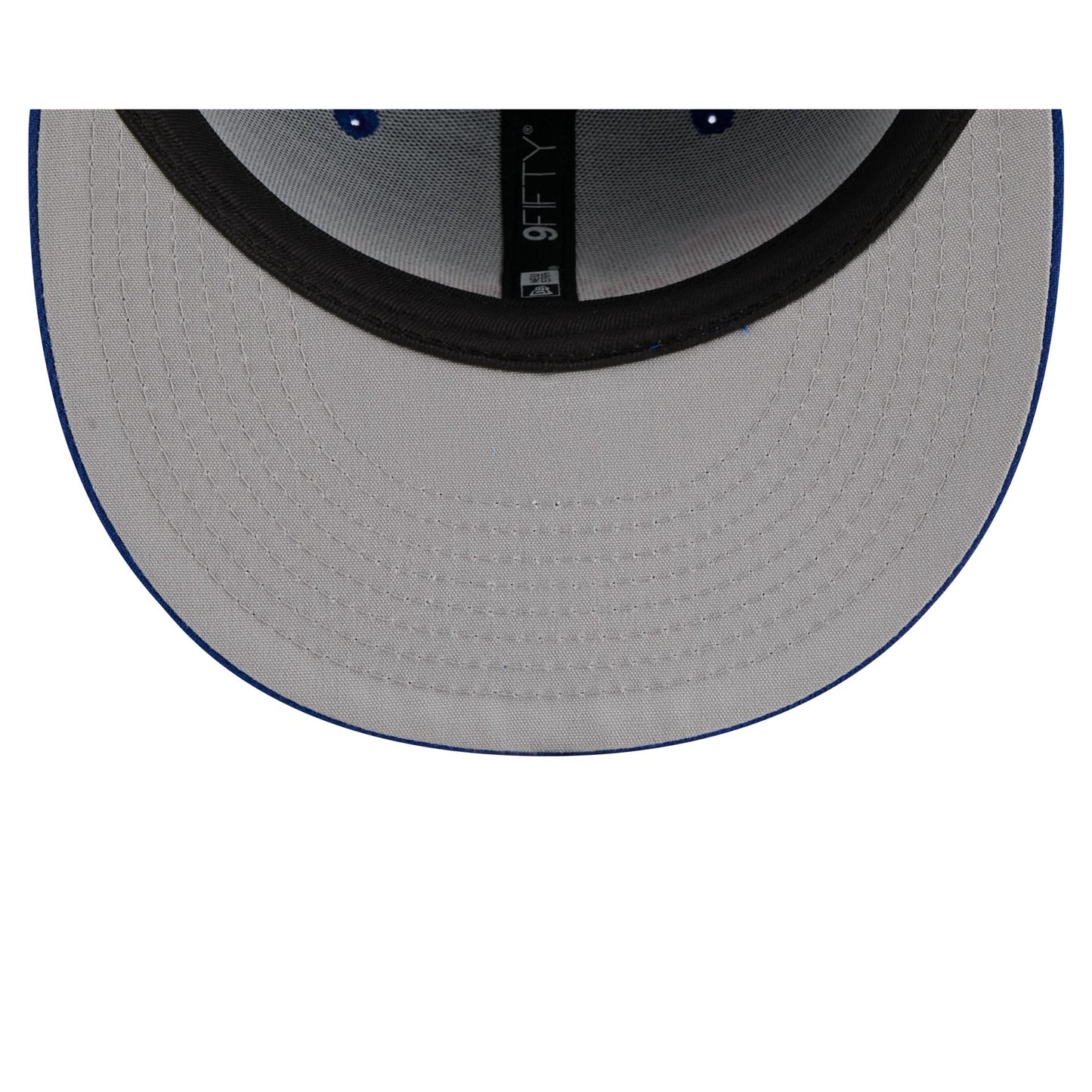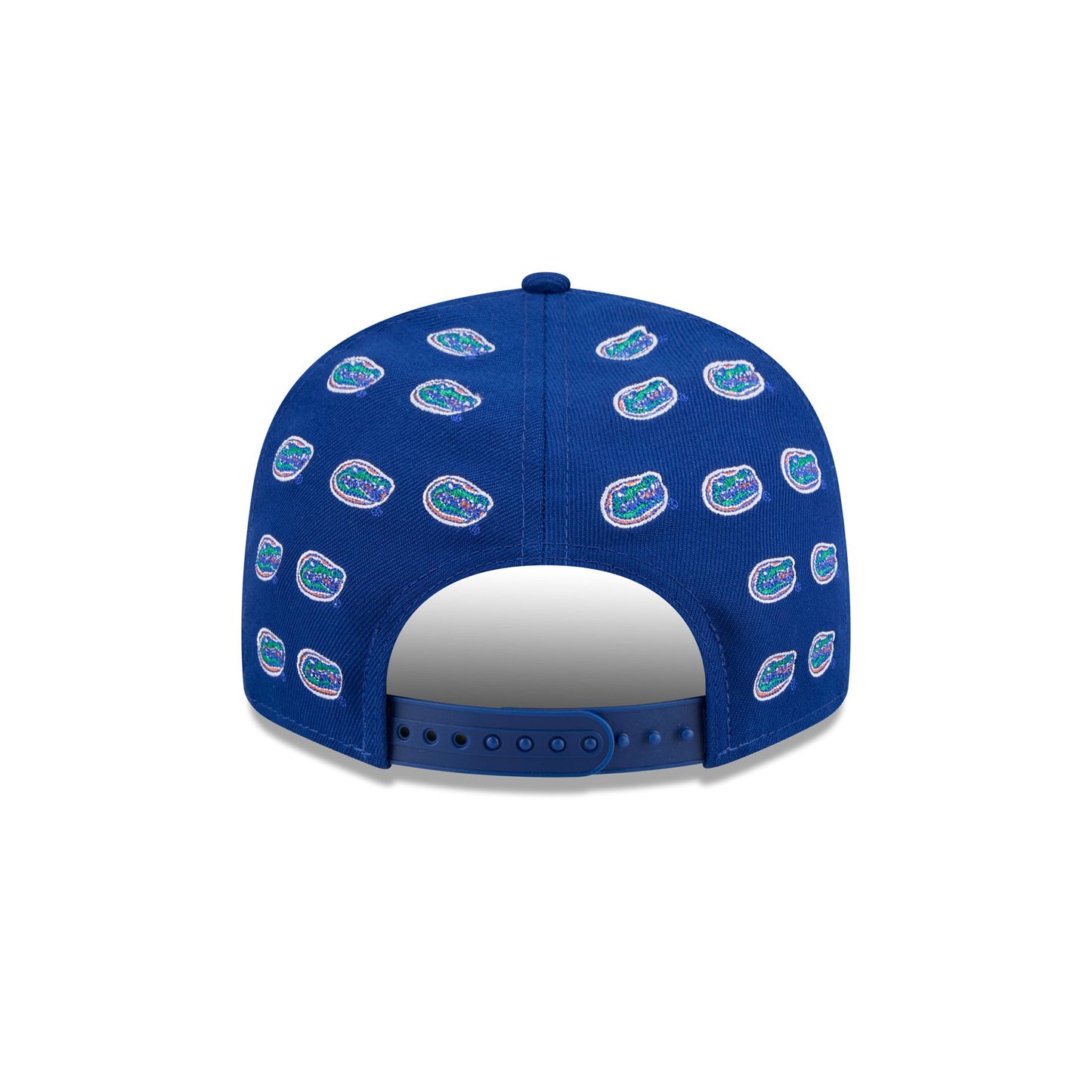 The Florida Gators Sticker Helmet 9FIFTY Snapback features an embroidered Gators logo at the front panels with embroidered team stickers the back panels. Additional details include an adjustable snapback closure at the rear and a gray undervisor.