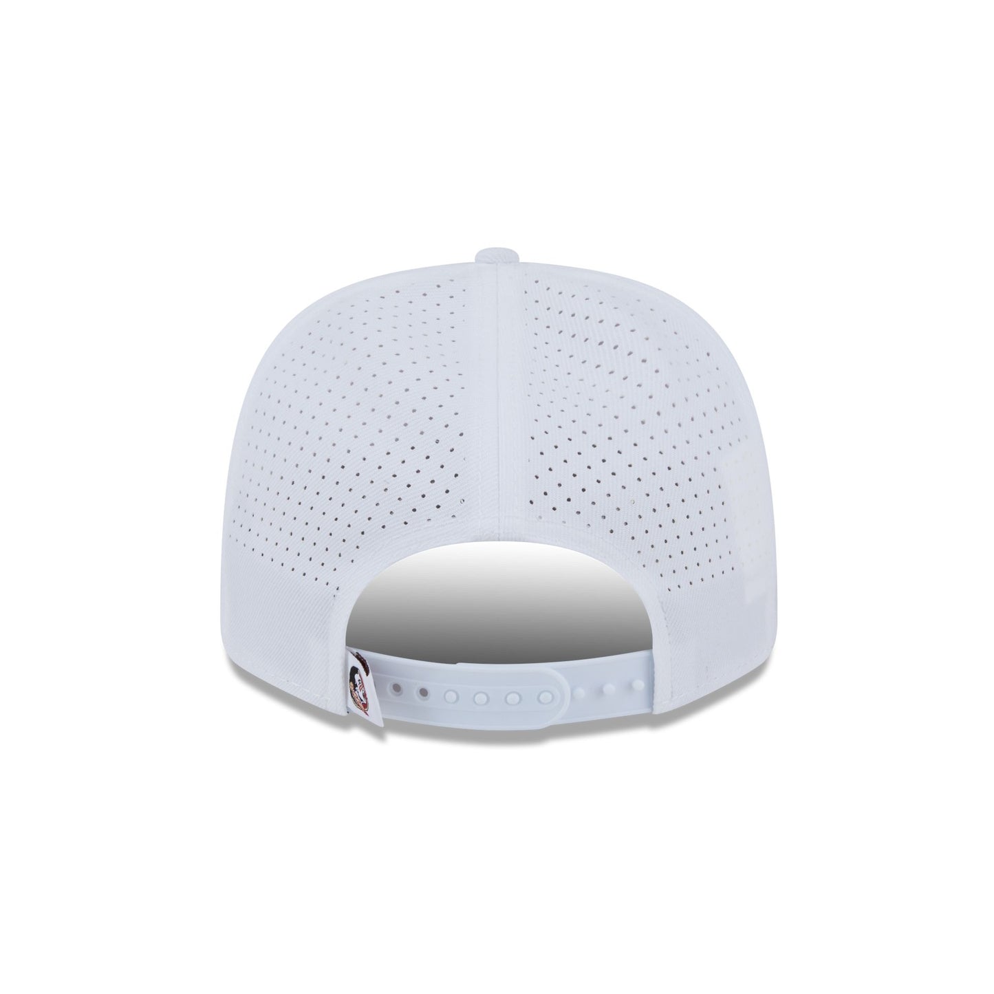 The Florida State Seminoles Optic White Performance 9SEVENTY Stretch-Snap features an embroidered Seminoles logo at the front panels with an adjustable stretch-snap closure at a performance mesh rear.