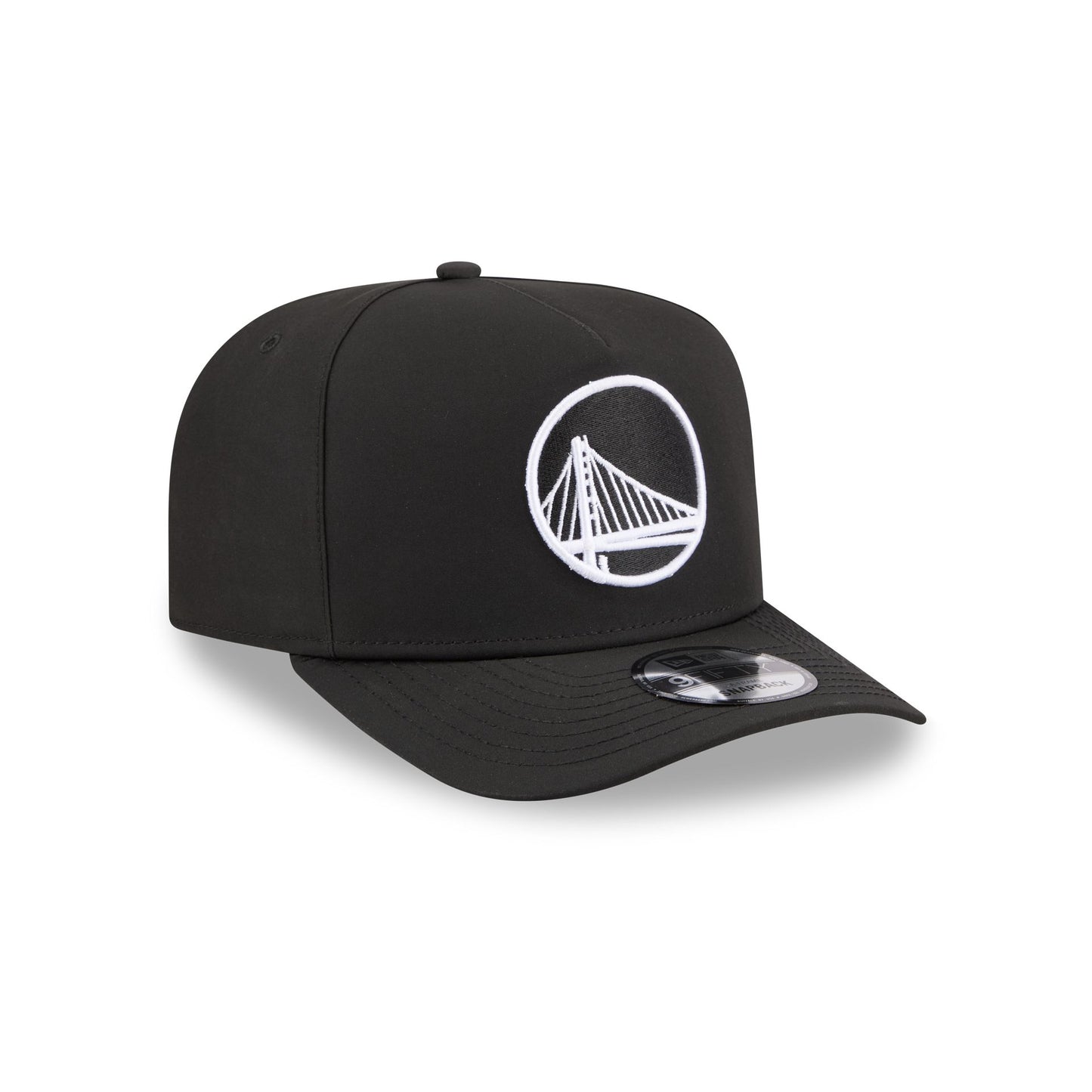 The Golden State Warriors GORE-TEX Black 9FIFTY A-Frame Snapback features an embroidered white Warriors logo at the front panels with a metallic sheen silicone New Era Flag logo and GORE-TEX logo at the left-wear side. Additional details include an adjustable snapback closure at the rear, a gray undervisor, and a polyester fabrication throughout the cap. It is waterproof, breathable, and lightweight.