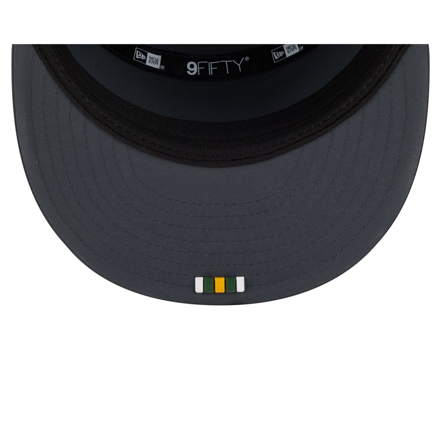 The Green Bay Packers 2025 Sideline Cold Weather Steel Clouds Split Panel 9FIFTY Snapback features a sewn-down silicone Packers logo patch at the front panels with a split-crown construction and diamond quilting. The cap has a water-repellent quill tech fabrication throughout, with a quick-dry cushioned sweatband to absorb moisture. Additional details include the Official NFL Shield logo to the right of a soft silicone snapback closure at the rear with eyelets at each side panel. The undervisor is accented with a silicone transfer in the team’s colors.