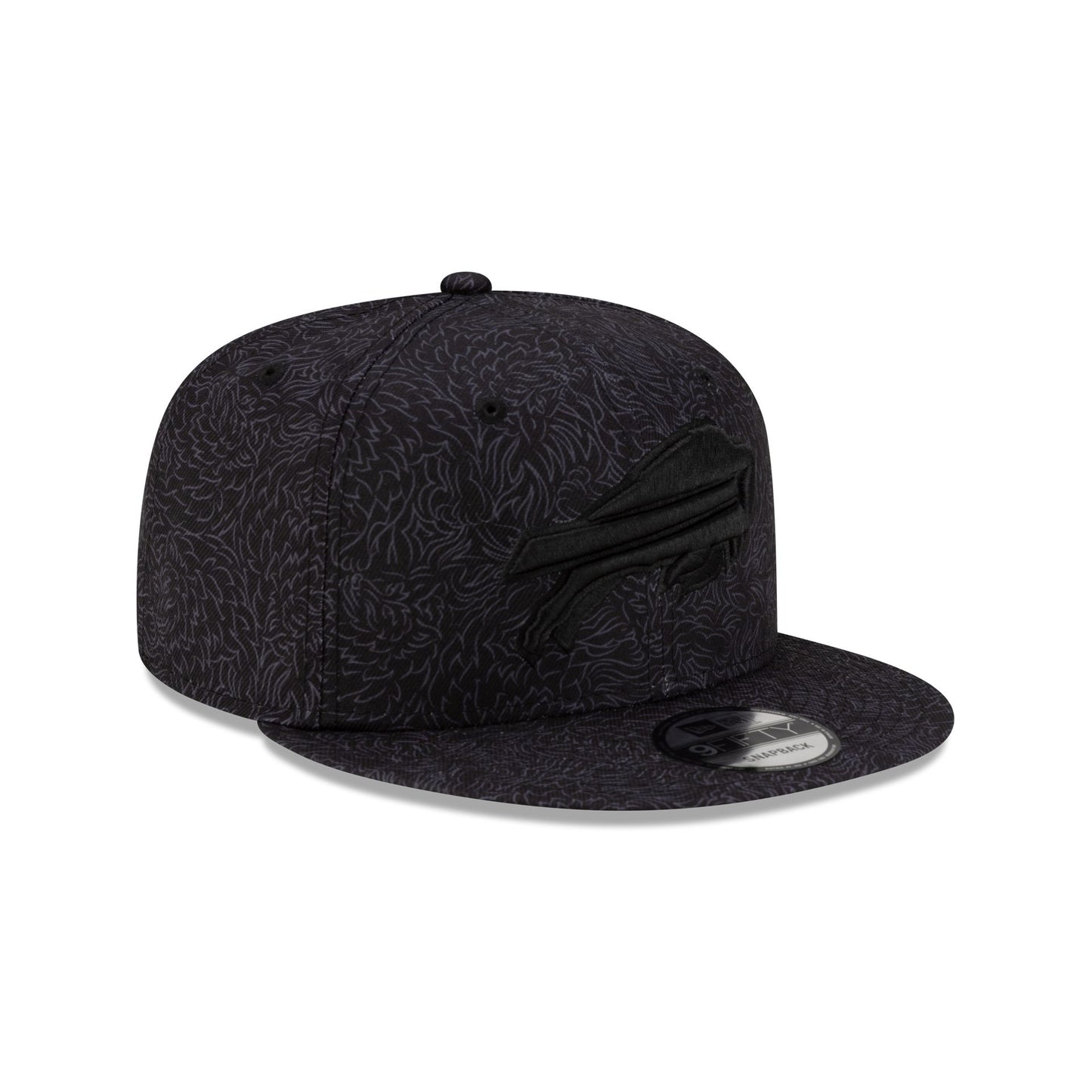 The Greyson Clothiers x Buffalo Bills Den of Thieves 9FIFTY Snapback features an embroidered black Bills logo at the front panels with a monochromatic Den of Thieves print throughout the cap. Additional details include a Greyson Clothiers tag on an adjustable snapback closure at the rear and a black undervisor.