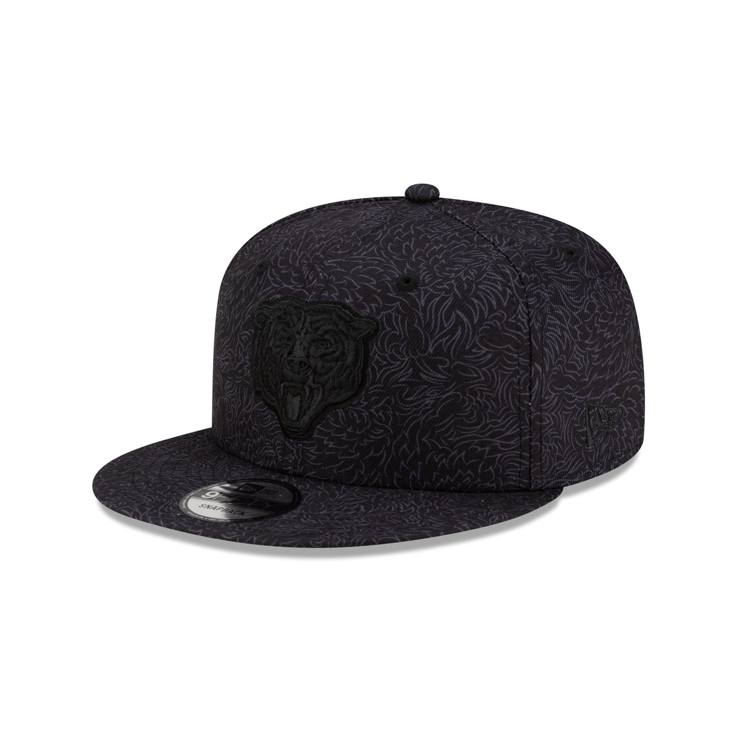 The Greyson Clothiers x Chicago Bears Den of Thieves 9FIFTY Snapback features an embroidered black Bears logo at the front panels with a monochromatic Den of Thieves print throughout the cap. Additional details include a Greyson Clothiers tag on an adjustable snapback closure at the rear and a black undervisor.
