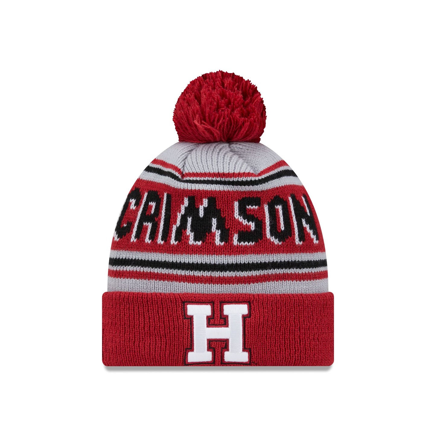 The Harvard Crimson Go-To Pom Knit Hat features an embroidered Crimson logo at the front cuff with a wordmark at the crown and a one-time removable pom.