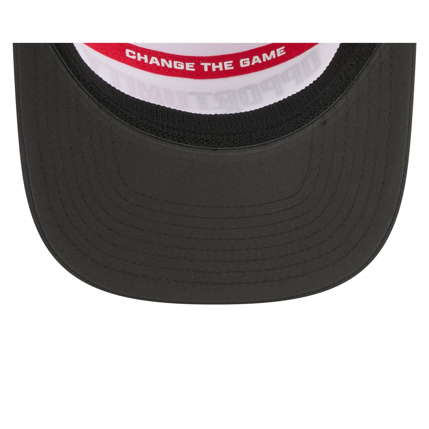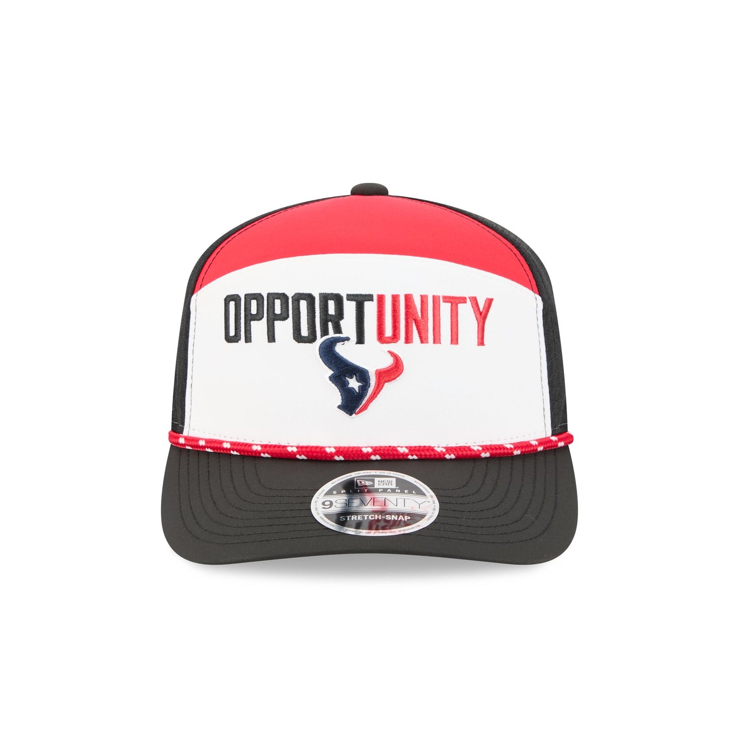 The Houston Texans 2025 Inspire Change Split Panel 9SEVENTY Trucker features an embroidered Texans logo and matching "Opportunity" wordmark at the front panels with an NFL Inspire Change patch at the right-wear side. Additional details include a rope at the visor and an adjustable stretch-snap closure at the rear. The cap has a split crown construction.