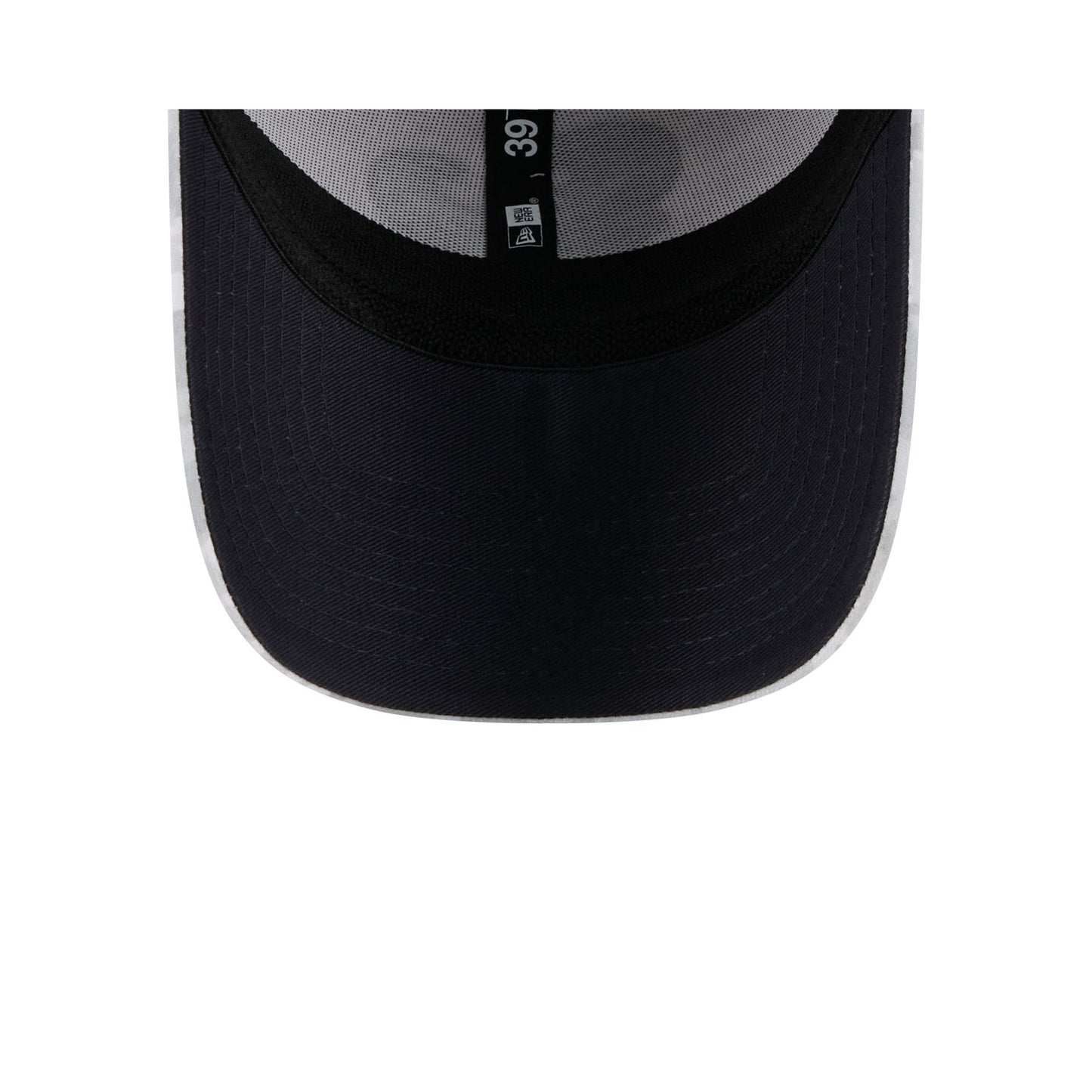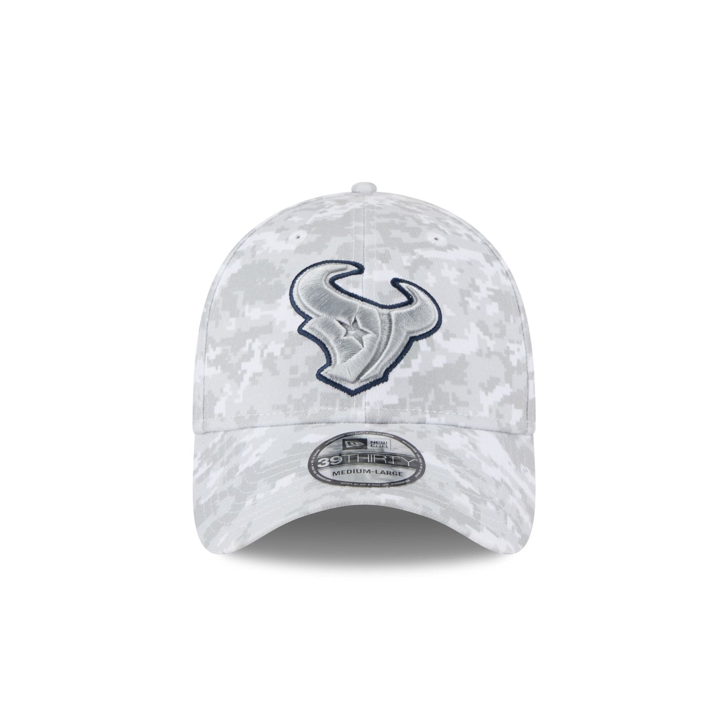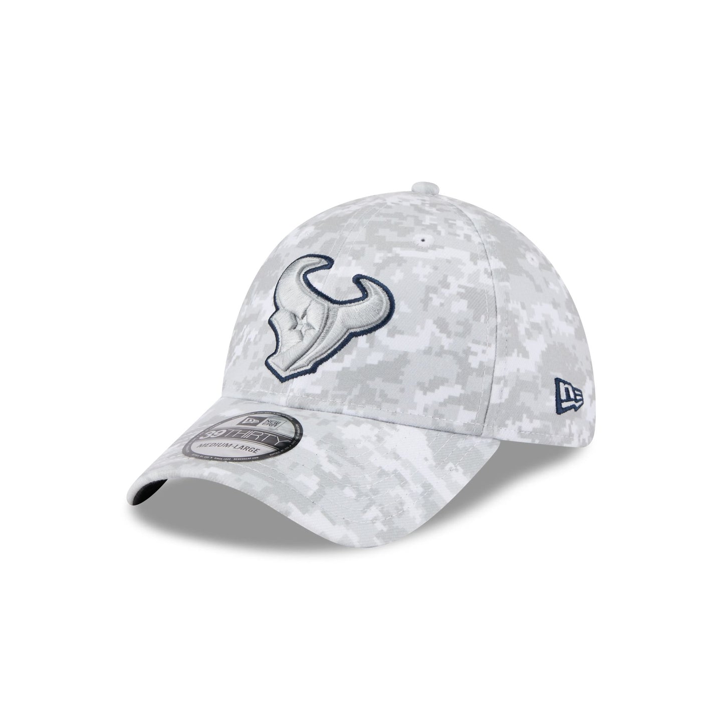 The Houston Texans 2025 Salute to Service Fan Gear 39THIRTY Stretch Fit Cap features an embroidered Texans logo at the front panels with the official NFL Salute to Service patch at the rear, an American flag patch at the right-wear side, and a team color undervisor.