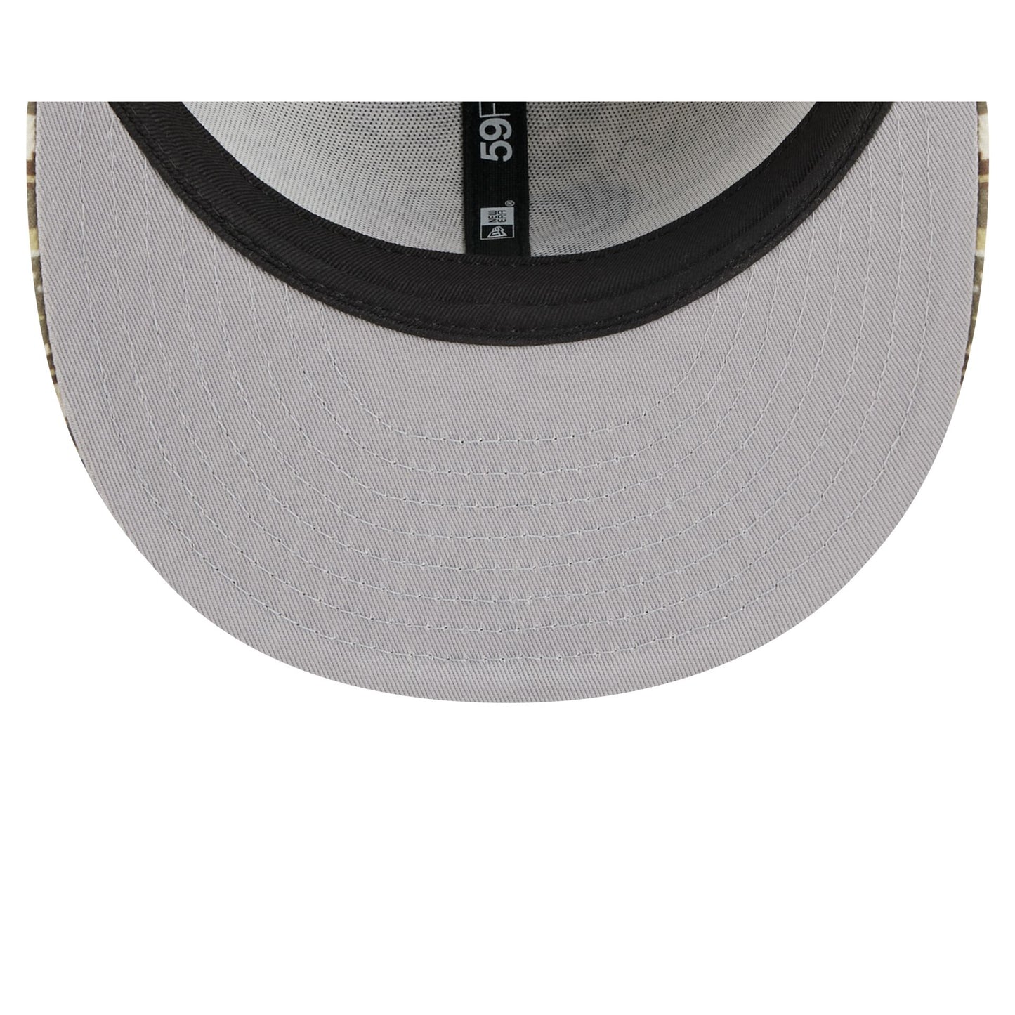 The Houston Texans 2025 Salute to Service Fan Gear 59FIFTY Fitted Cap features an embroidered Texans logo at the front panels with the official NFL Salute to Service patch at the rear, an American flag patch at the right-wear side, and a gray undervisor.