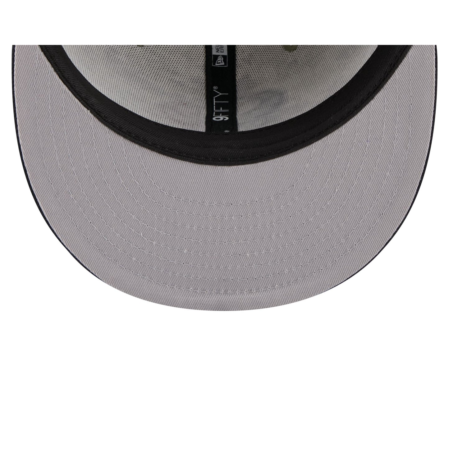 The Houston Texans 2025 Salute to Service Fan Gear 9FIFTY Snapback features an embroidered Texans logo at the front panels with the official NFL Salute to Service patch above a snapback closure at the rear. Additional details include an American flag patch at the right-wear side with team color visor and a gray undervisor.