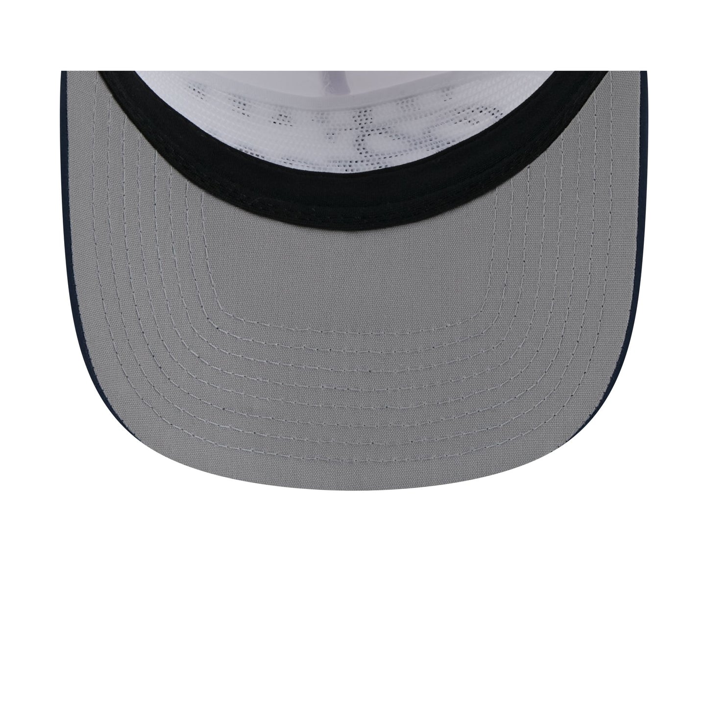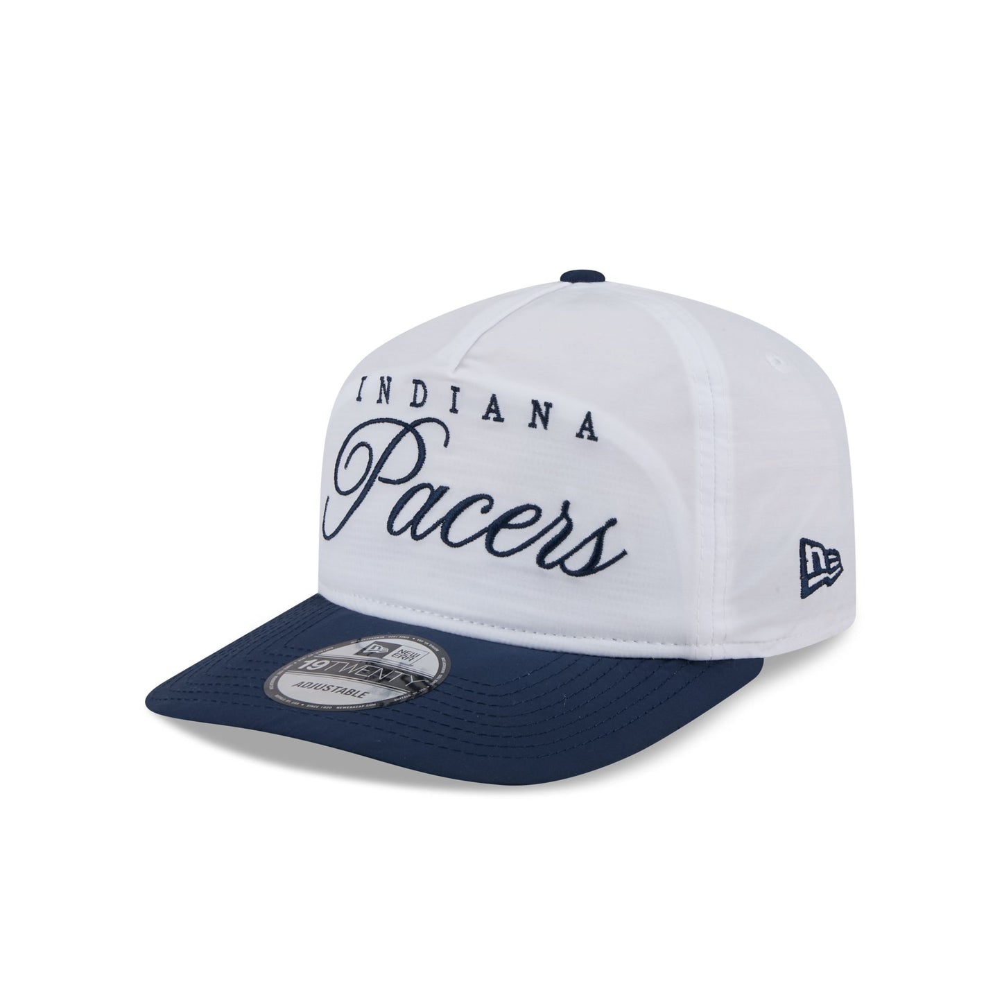 The Indiana Pacers 2025 Draft 19TWENTY Adjustable Cap features an embroidered Pacers script wordmark at the front panels with a team logo at the right-wear side. Additional details include a woven silicone NBA Logoman patch above an adjustable buckle closure at the rear and a gray undervisor. The strap features a National Basketball Association gel print wordmark.
