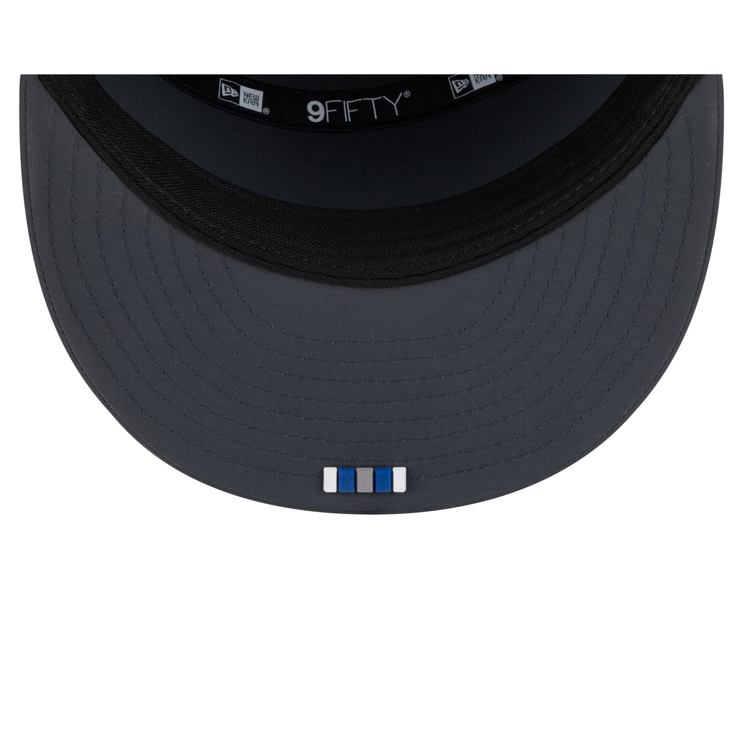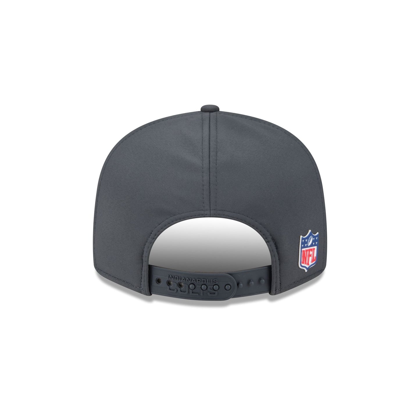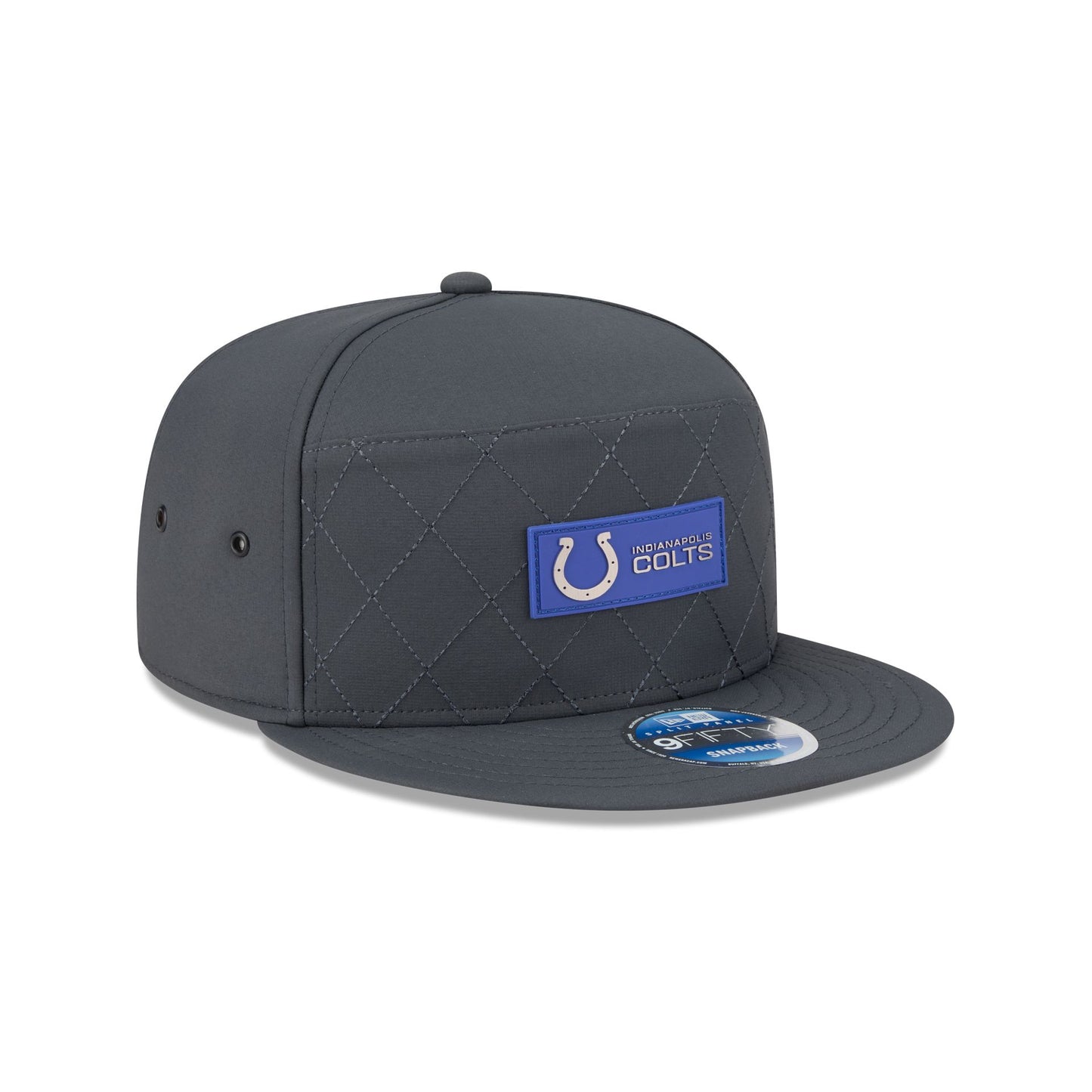 The Indianapolis Colts 2025 Sideline Cold Weather Steel Clouds Split Panel 9FIFTY Snapback features a sewn-down silicone Colts logo patch at the front panels with a split-crown construction and diamond quilting. The cap has a water-repellent quill tech fabrication throughout, with a quick-dry cushioned sweatband to absorb moisture. Additional details include the Official NFL Shield logo to the right of a soft silicone snapback closure at the rear with eyelets at each side panel. The undervisor is accented with a silicone transfer in the team’s colors.