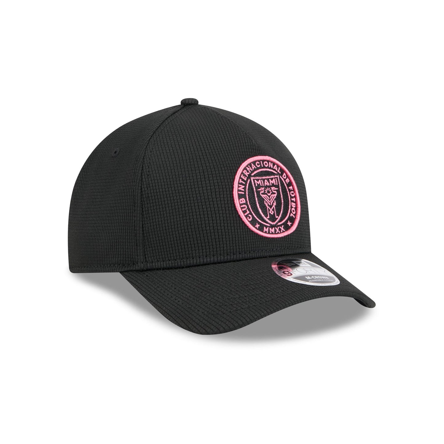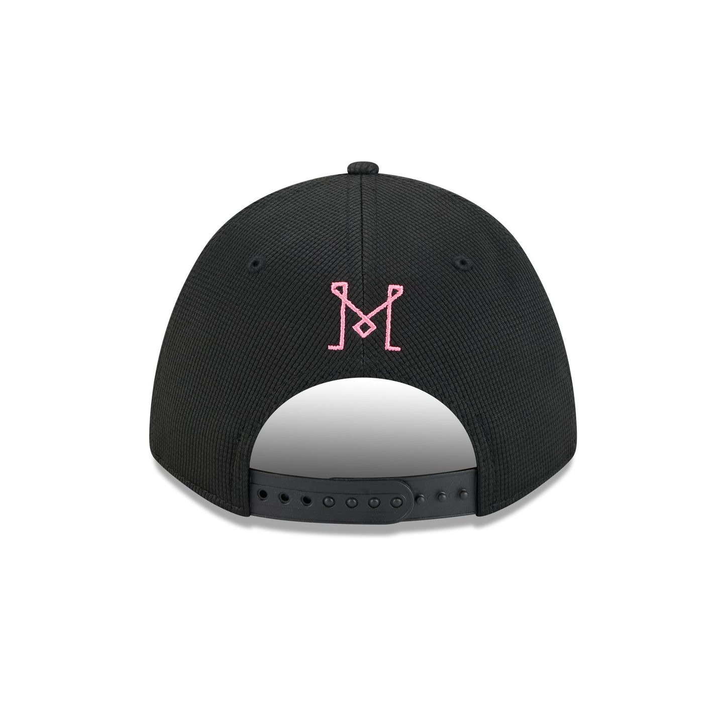The Inter Miami 2025 Jersey Hook 9FORTY M-Crown A-Frame Snapback features an embroidered Inter Miami logo at the front panels with a logo above a snapback closure at the rear.