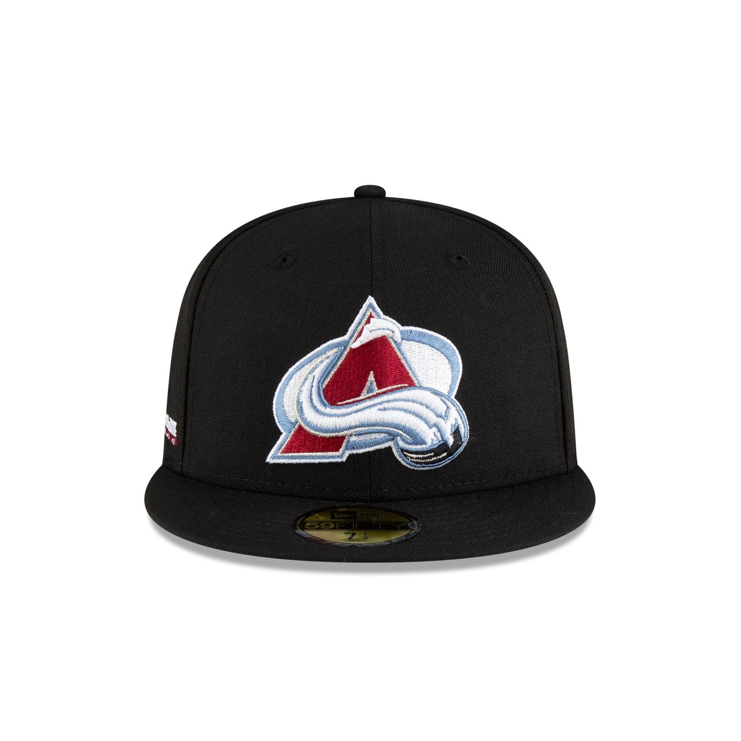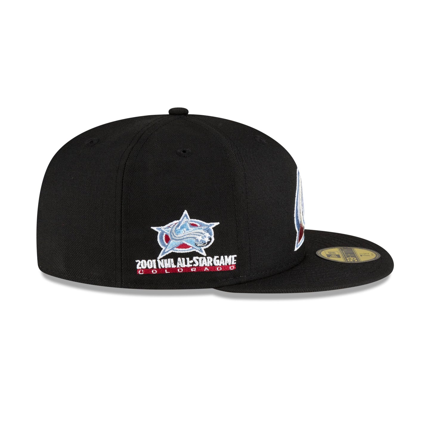 The Just Caps NHL All-Star Game Colorado Avalanche 59FIFTY Fitted Cap features an embroidered Avalanche logo at the front panels with a matching NHL Shield at the rear, a 2001 All-Star Game patch at the right-wear side, and a gray undervisor.