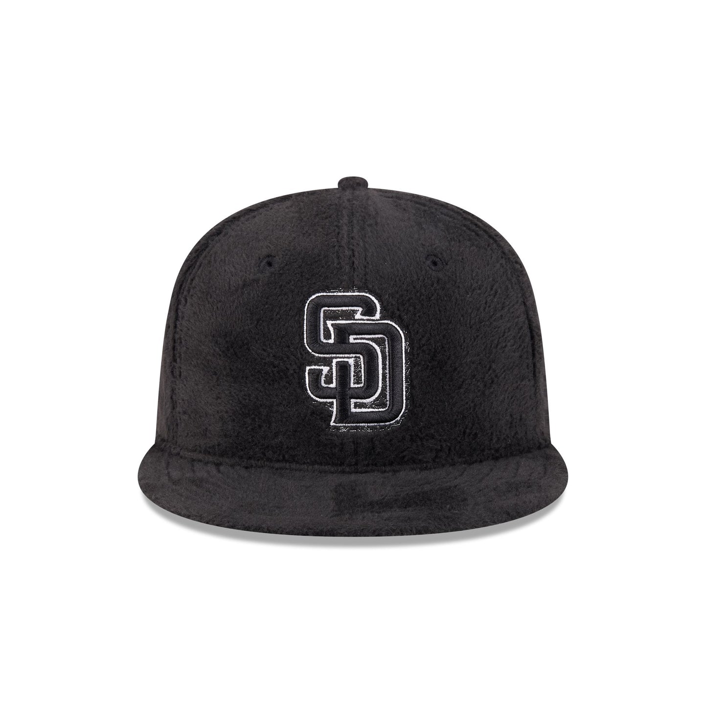 The Just Caps Static Logo San Diego Padres 59FIFTY Fitted Cap features a black and white embroidered Padres logo at the front panels with a matching MLB Batterman logo at the rear. Additional details include a 2016 All-Star Game patch at the right-wear side with a black fleece allover fabrication and a gray undervisor.