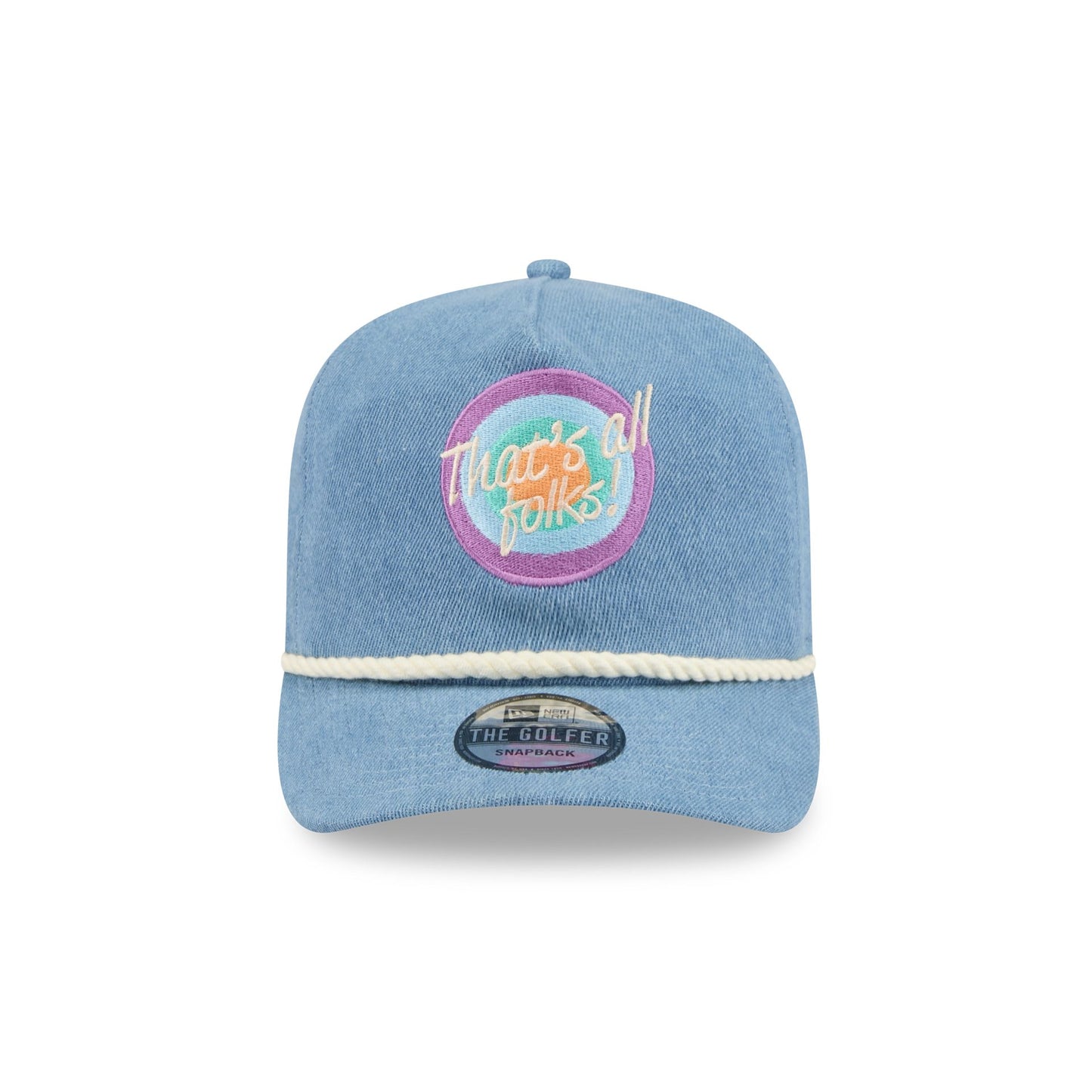 The That's All Folks Golfer features an embroidered Looney Tunes "That's All Folks" graphic at the front panels with a rope at the visor. Additional details include a Looney Tunes wordmark at the right-wear side and an adjustable snapback closure at the rear.