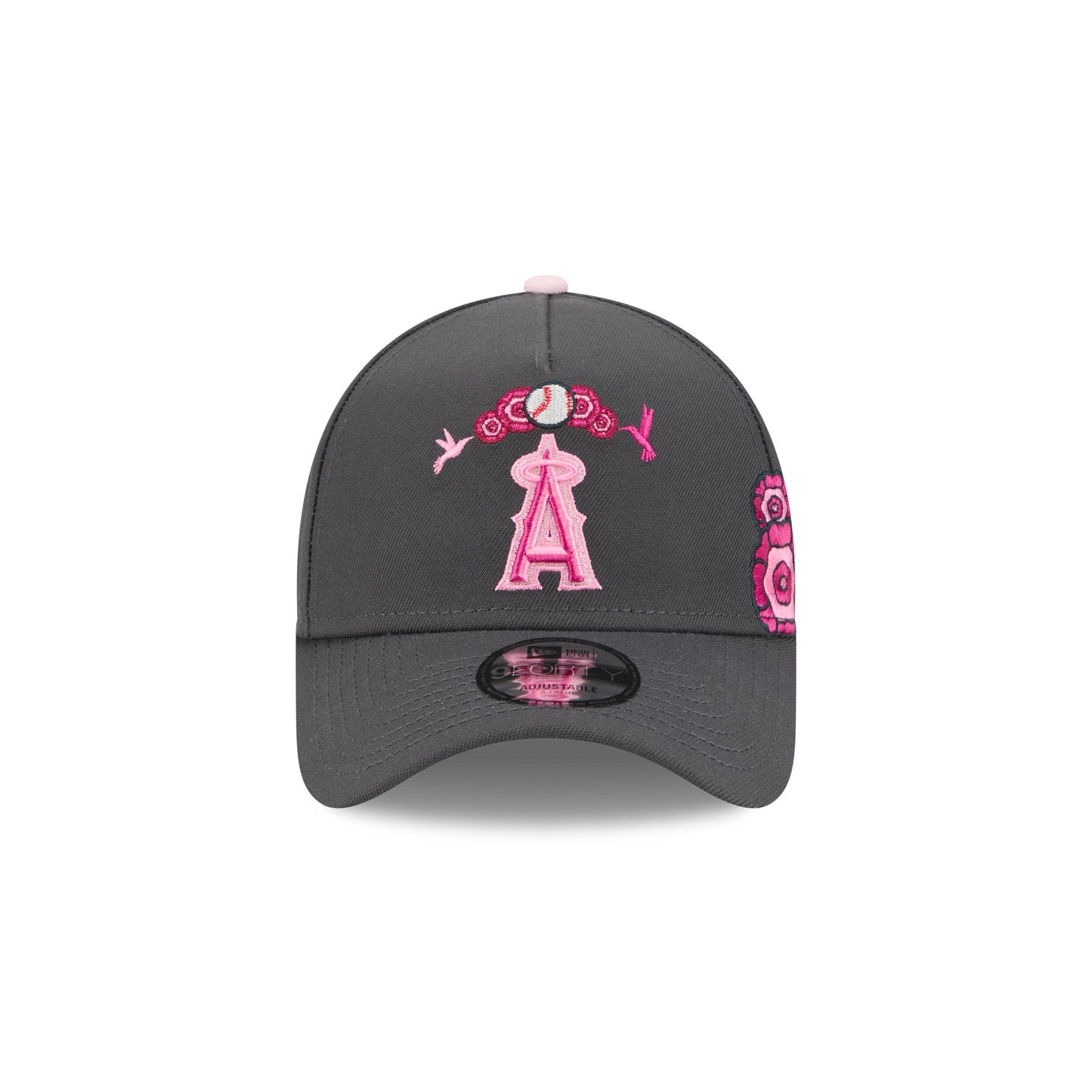 The Los Angeles Angels Day of the Dead Graphite 9FORTY A-Frame Snapback features an embroidered Angels logo at the front panels with marigold (cempasúchil) and hummingbird designs throughout, representing the Legend of Xóchitl and Huitzilin. Additional details include a team patch at the right-wear side and an adjustable snapback closure at the rear.