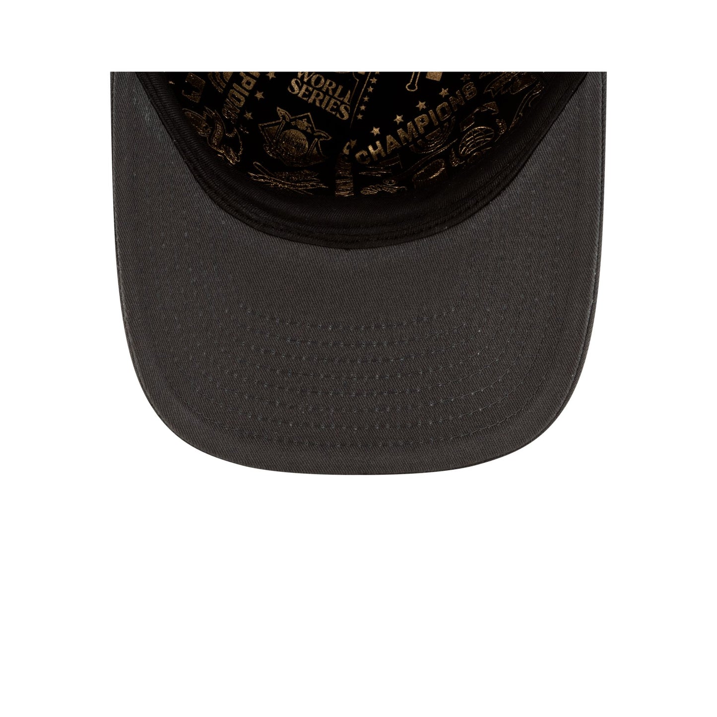 The Los Angeles Dodgers 2025 World Series Champions Parade 9FIFTY A-Frame Snapback features an embroidered Dodgers 2025 World Series Champions Commissioner's Trophy graphic at the front panels with the team logo at the right-wear side. Additional details include the Commissioner's Trophy pin at the right-wear side and the MLB Batterman logo above an adjustable snapback closure at the rear.
