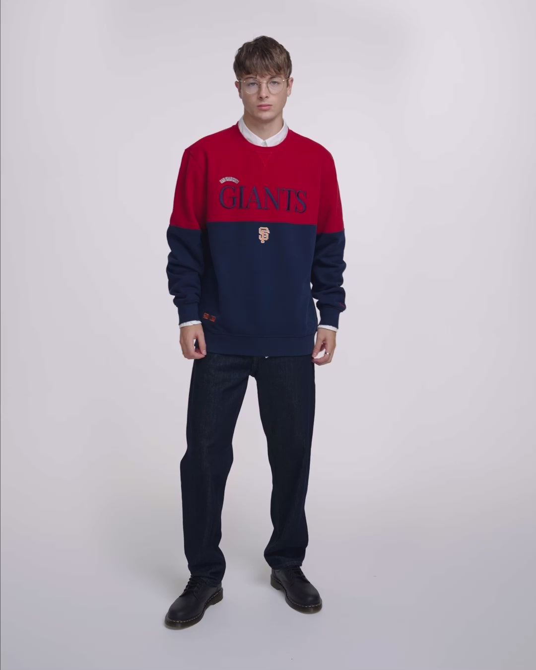The Los Angeles Dodgers Two-Tone Quiet Harbor Crewneck features an embroidered Dodgers wordmark above a mini team logo at the chest. Additional details include a New Era box logo and MLB Batterman logo at the right hem with a split color panel fabrication.