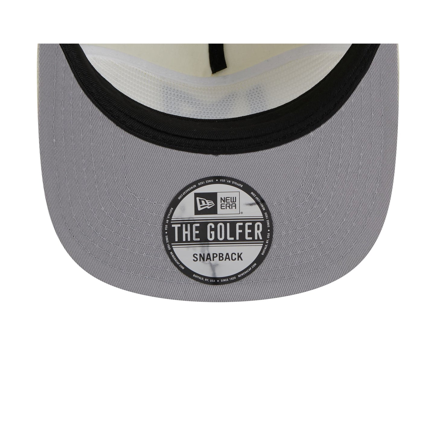 The Los Angeles FC 2025 MLS Kickoff Golfer features an embroidered Los Angeles FC logo at the front panel with a matching MLS Shield above a snapback closure at the rear and a gray undervisor.