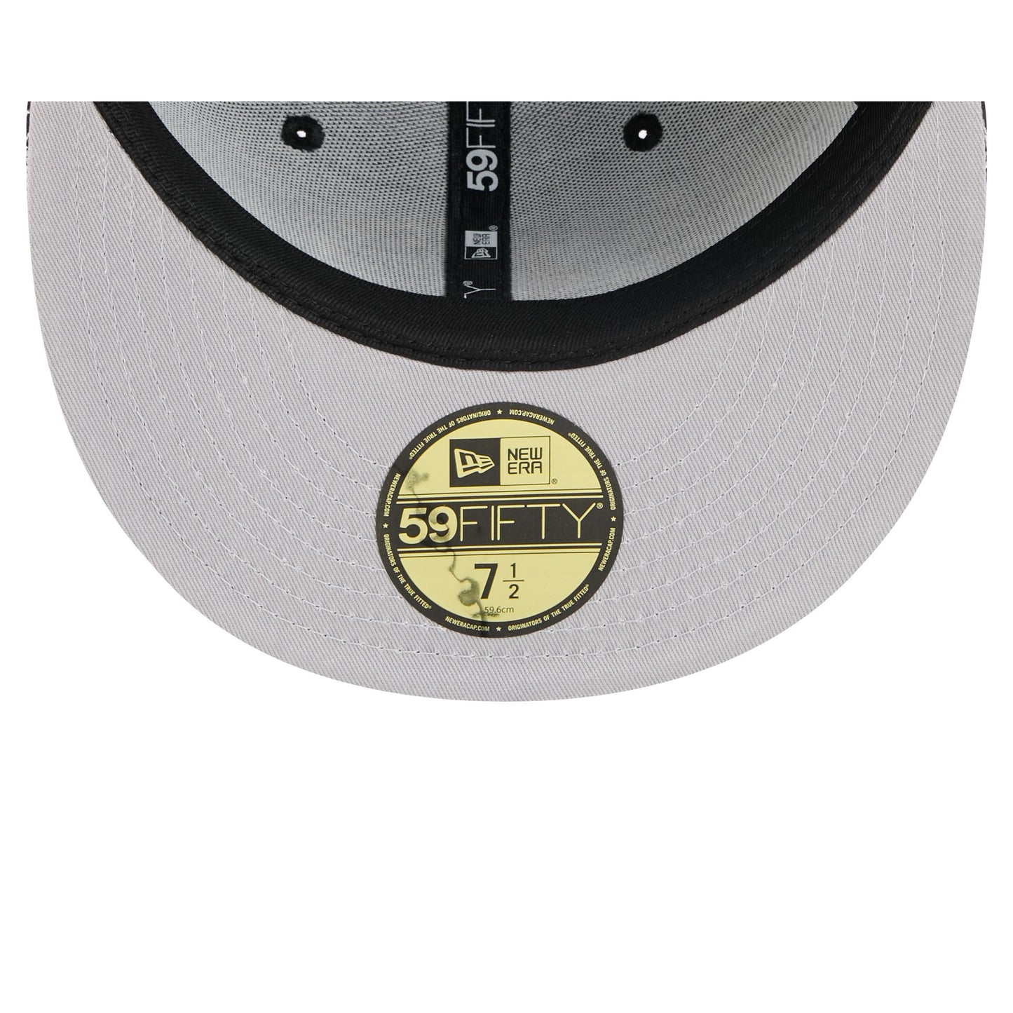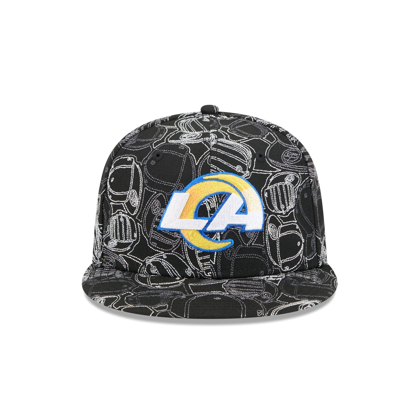The Los Angeles Rams Cap Scramble 59FIFTY Fitted Cap features an embroidered Rams logo at the front panels with chainstitched allover cap patterned fabrication, an NFL Shield at the rear, and a gray undervisor.