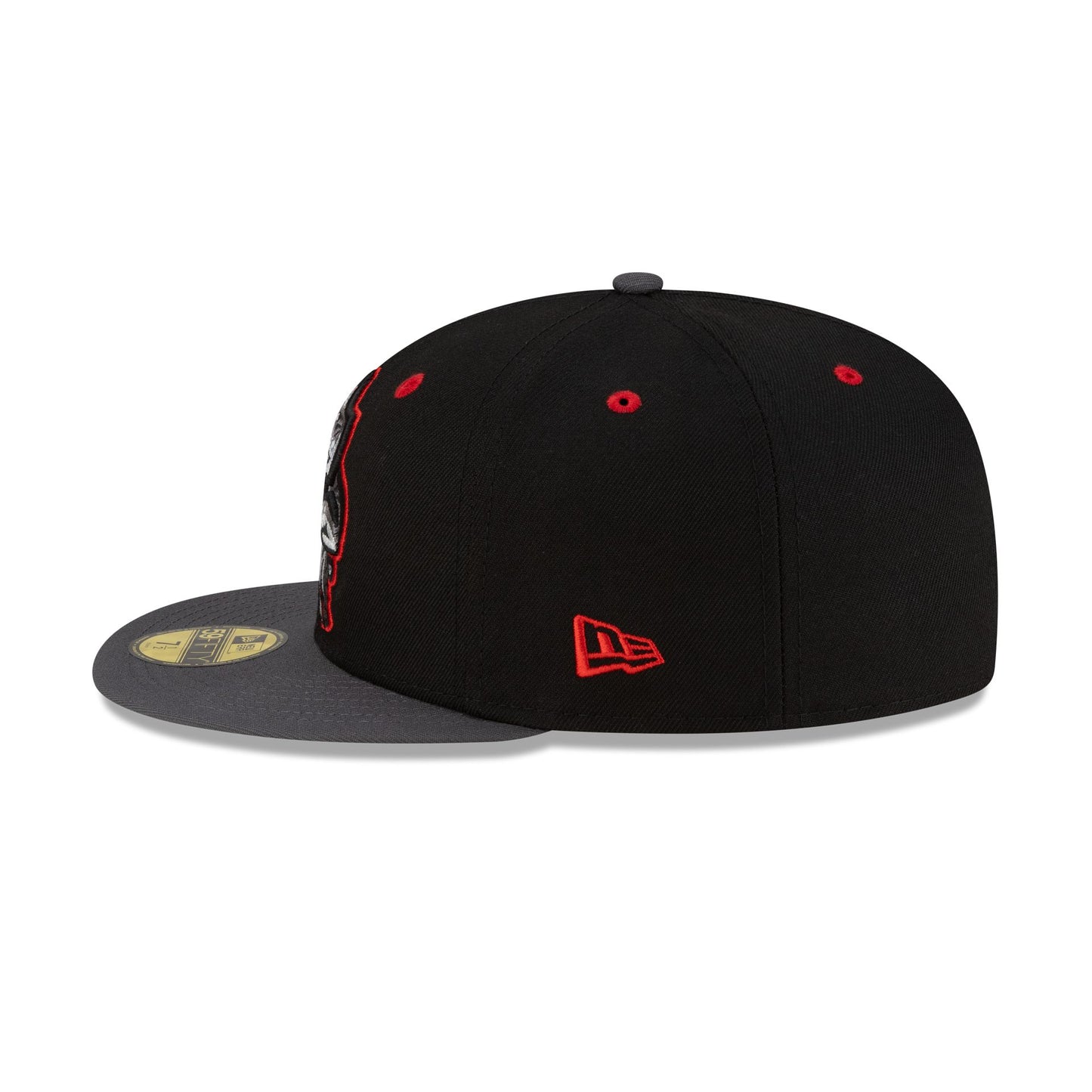 The Lynchburg Hillcats Halloween Red 59FIFTY Fitted Cap features an embroidered Hillcats themed logo at the front panels with a matching MiLB Batterman logo at the rear, a gray visor, and a red undervisor.