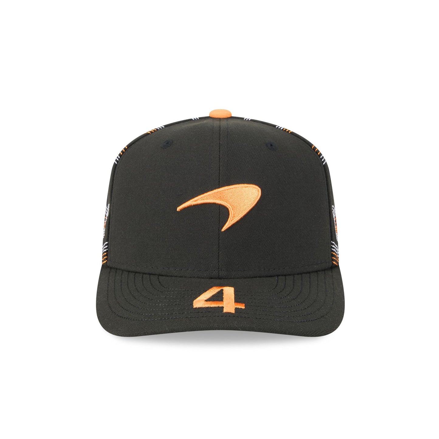 The McLaren Formula 1 Team 2025 Austin Race Special Lando Norris 9SEVENTY Stretch-Snap features an embroidered McLaren Racing logo at the front panels with the driver's number at the visor. Additional details include stitching at each sides, a McLaren tag logo above an adjustable stretch-snap closure at the rear, and initials at the undervisor.