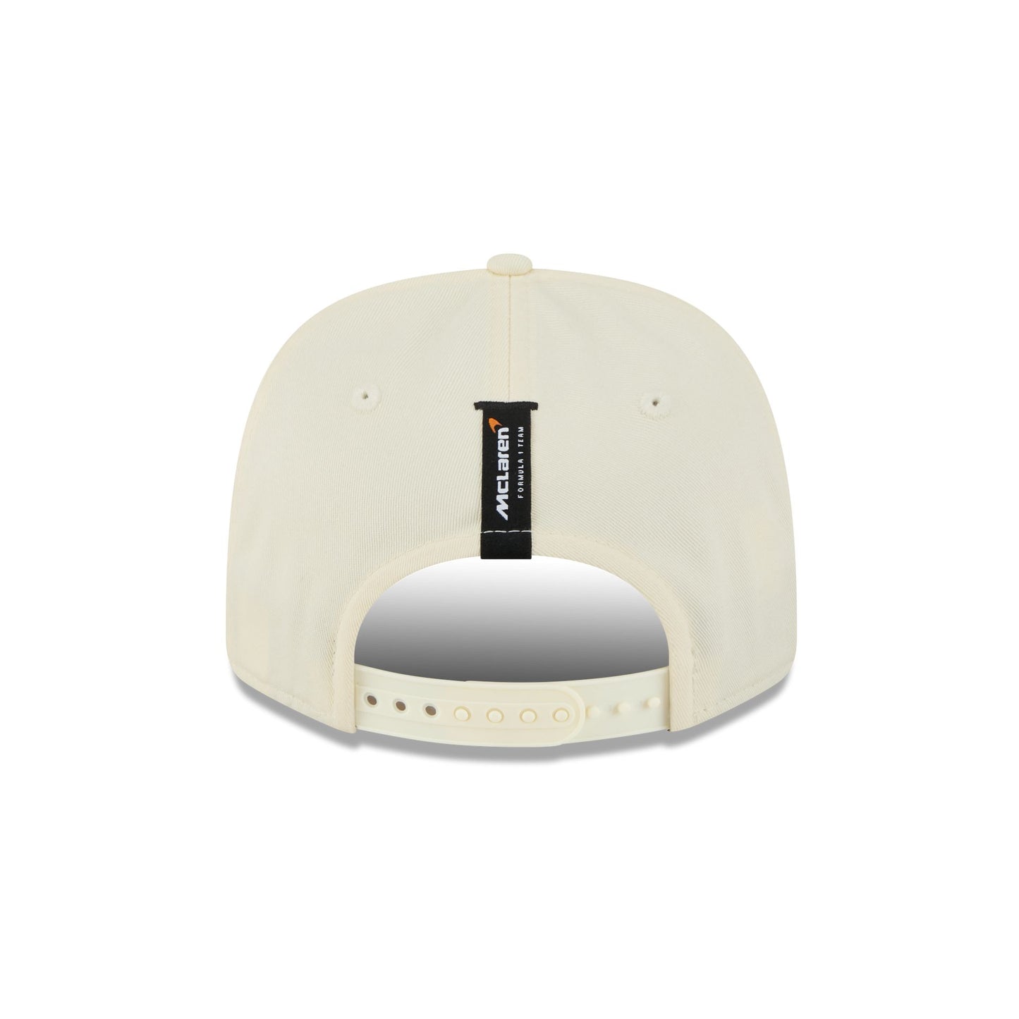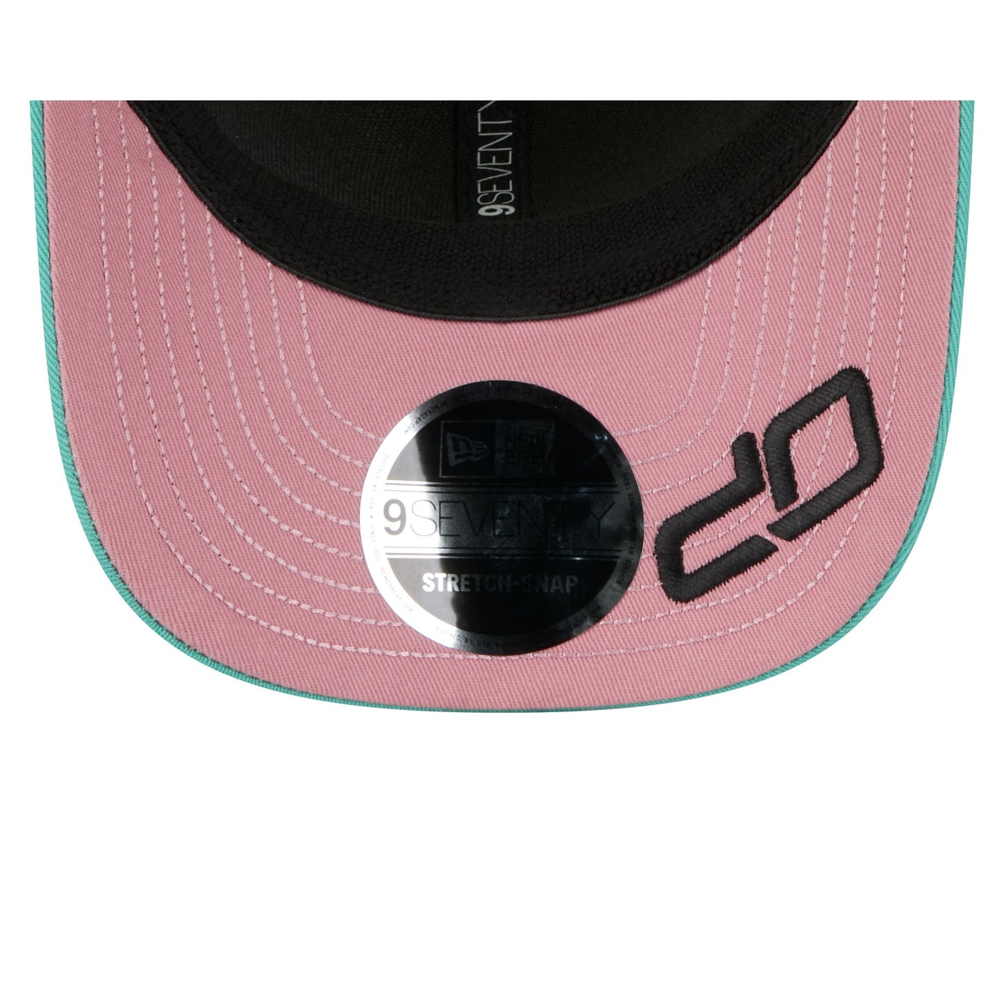 The McLaren Formula 1 Team 2025 Sao Paulo Race Special Oscar Piastri 9SEVENTY Stretch-Snap features an embroidered McLaren Racing logo at the front panels with a Mastercard logo at the right-wear side and the driver's number at the visor. Additional details include flowers at the visor, a McLaren tag logo above an adjustable stretch-snap closure at the rear, and initials at a pink undervisor.