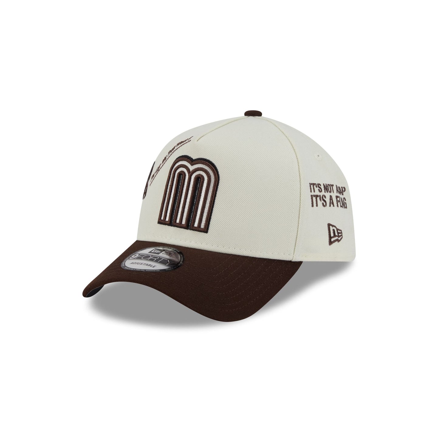 The Mexico Baseball New Era Anniversary Logos Brown Visor 9FORTY M-Crown A-Frame Snapback features an embroidered Mexico Baseball logo at the front panels with New Era Cap wordmark above a snapback closure at the rear. Additional details include New Era signature phrases and badges throughout the crown with a brown visor and a gray undervisor.
