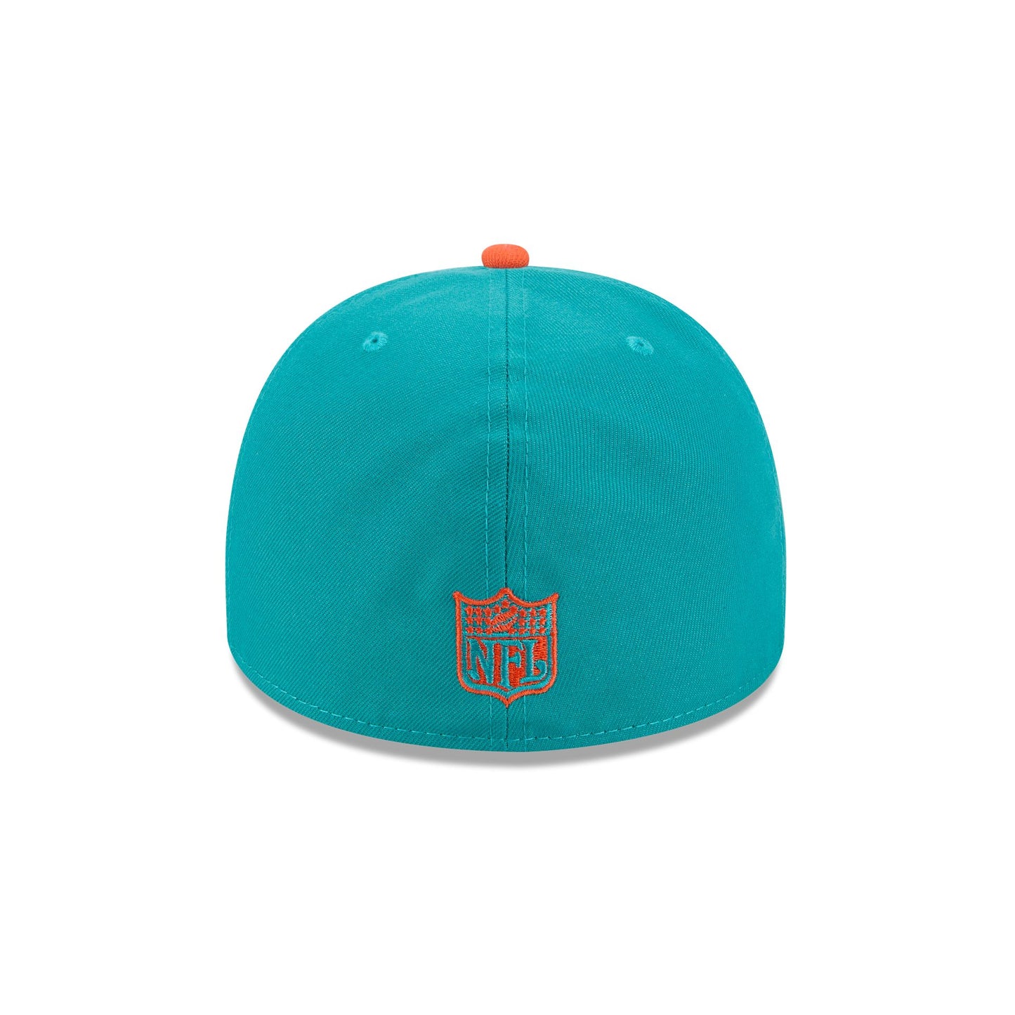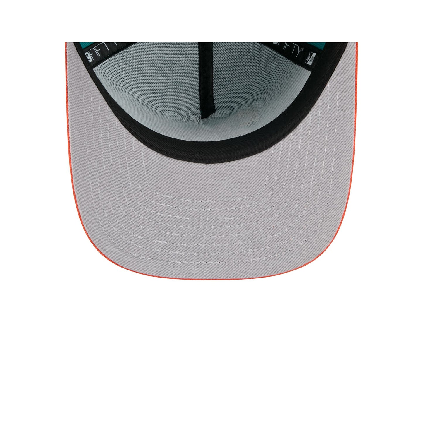 The Miami Dolphins Cartoon 59FIFTY A-Frame Fitted Cap features an embroidered Dolphins cartoon themed Historic logo at the front with a matching NFL Shield at the rear, a monochromatic team logo at the right-wear side, and a gray undervisor.