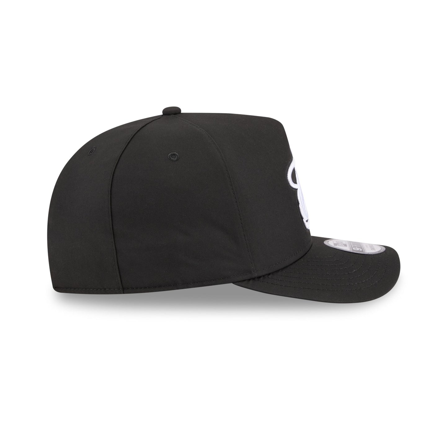 The Miami Heat GORE-TEX Black 9FIFTY A-Frame Snapback features an embroidered white Heat logo at the front panels with a metallic sheen silicone New Era Flag logo and GORE-TEX logo at the left-wear side. Additional details include an adjustable snapback closure at the rear, a gray undervisor, and a polyester fabrication throughout the cap. It is waterproof, breathable, and lightweight.