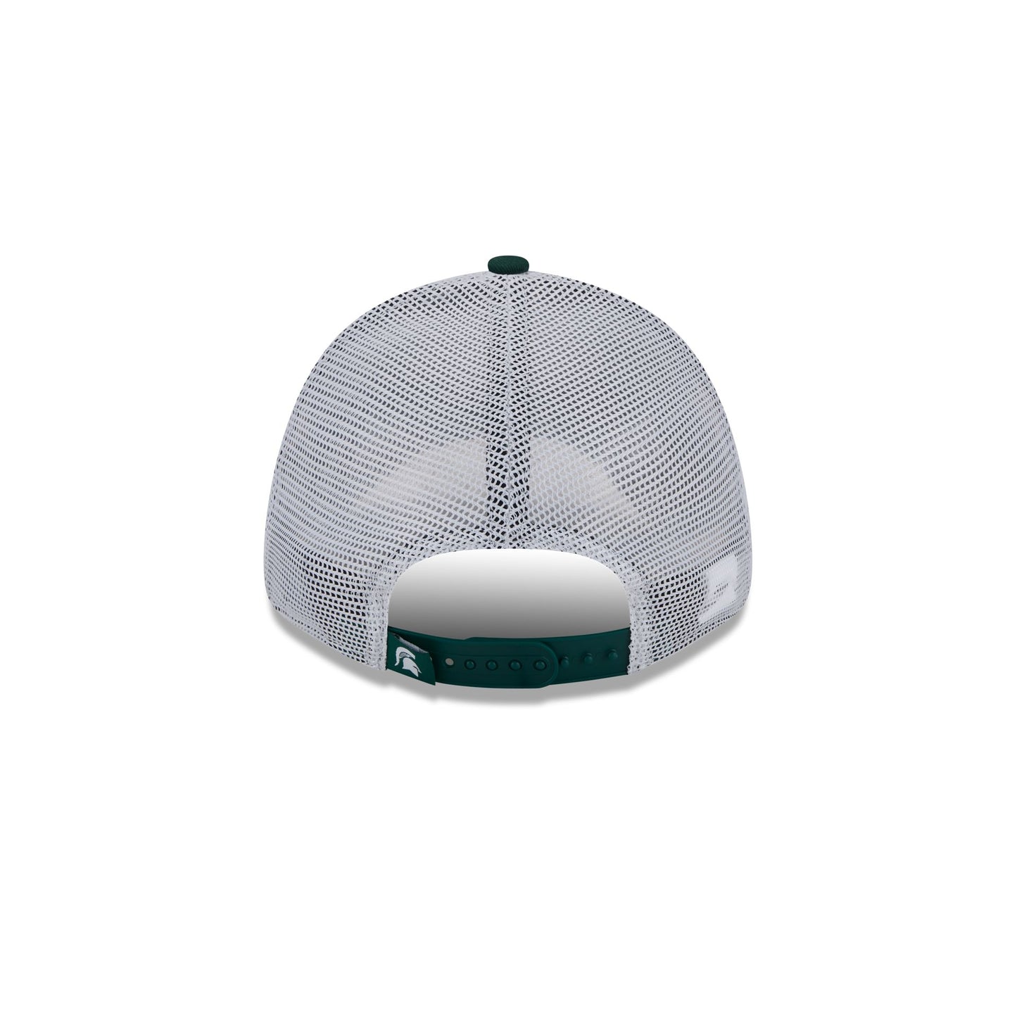 The Michigan State Spartans Green 9FORTY Trucker features an embroidered Spartans logo at the front panels with a matching woven team logo tag at the snapback closure at the rear.