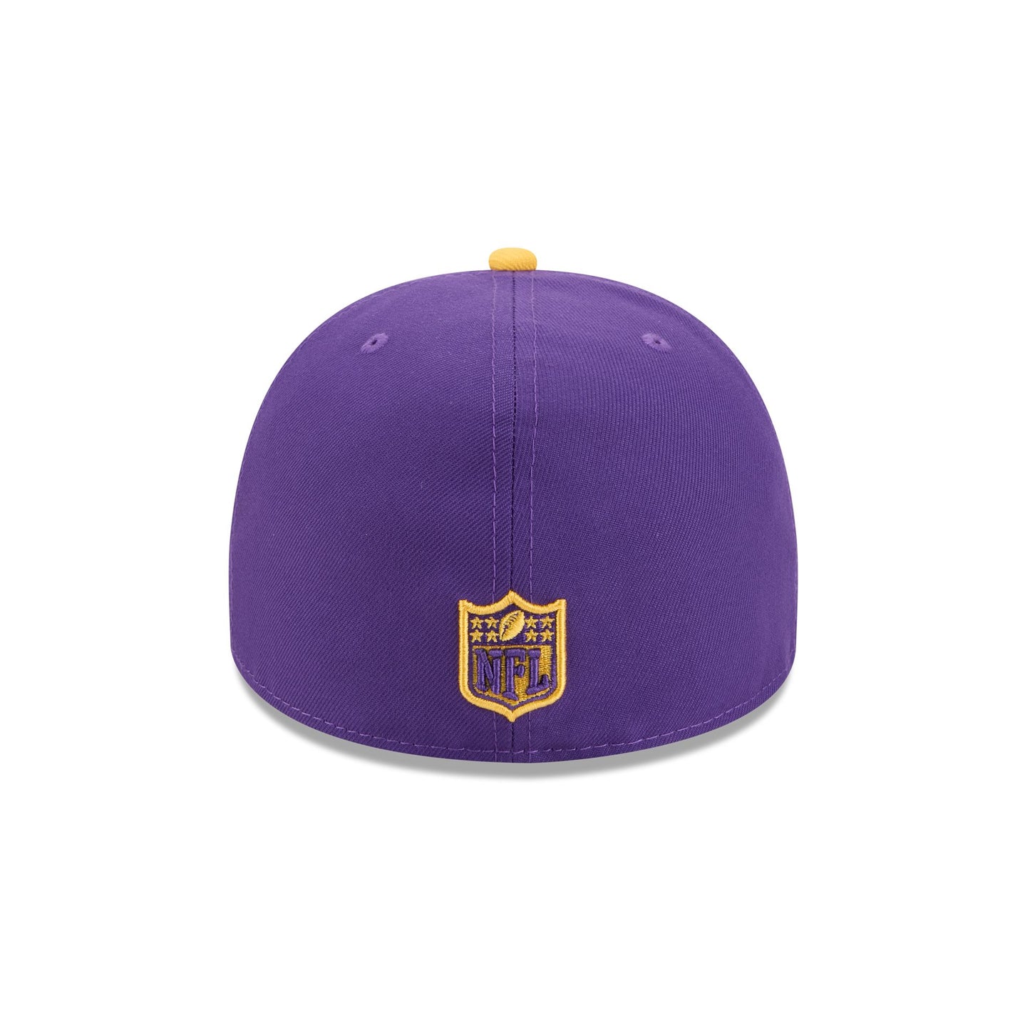 The Minnesota Vikings Cartoon 59FIFTY A-Frame Fitted Cap features an embroidered Vikings cartoon themed logo at the front with a matching NFL Shield at the rear, a monochromatic team logo at the right-wear side, and a gray undervisor.