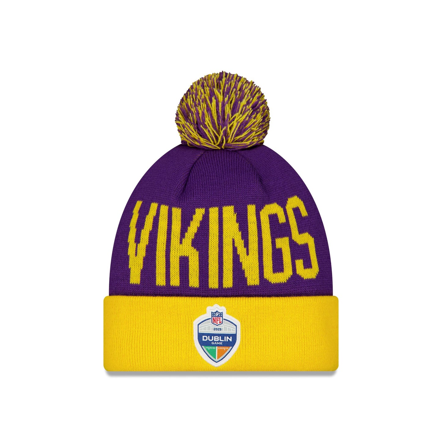The Minnesota Vikings Dublin Game Pom Knit features an embroidered Vikings logo at the front cuff with a Dublin Game patch at the rear and a one-time removable pom.