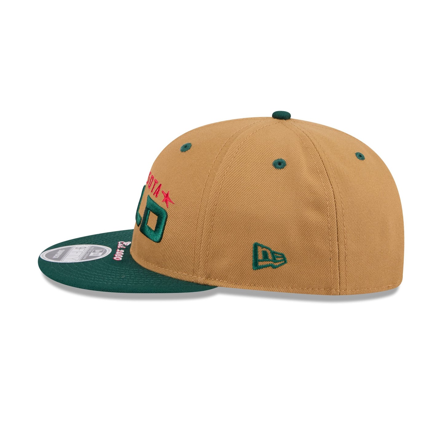 The Minnesota Wild Wheat Retro Crown 9FIFTY Snapback features an embroidered Wild logo at the front panels with an established date at the visor. Additional details include a snapback closure at the rear and a green undervisor.