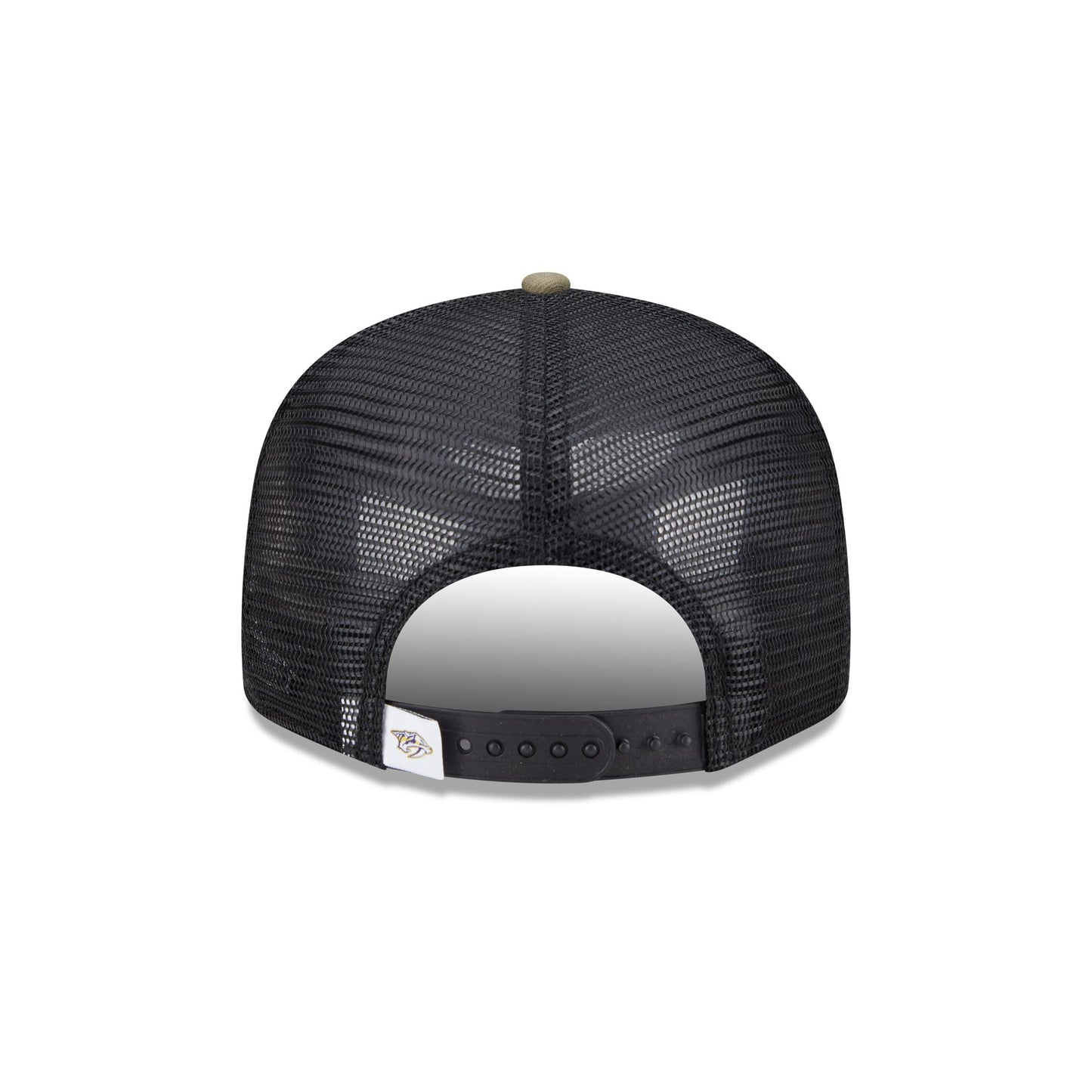The Nashville Predators Camo 9FIFTY Trucker features an embroidered Predators logo at the front panels with a team tag on a snapback closure at a mesh rear and a gray undervisor.